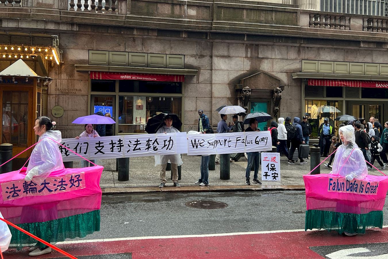 Na stanici Grand Central u 42. ulici na Manhattanu, paradu je pozdravilo nekoliko Kineza. Izrazili su svoju podršku držeći transparente na kineskom i engleskom jeziku na kojima je pisalo: „Podržavamo Falun Gong.“