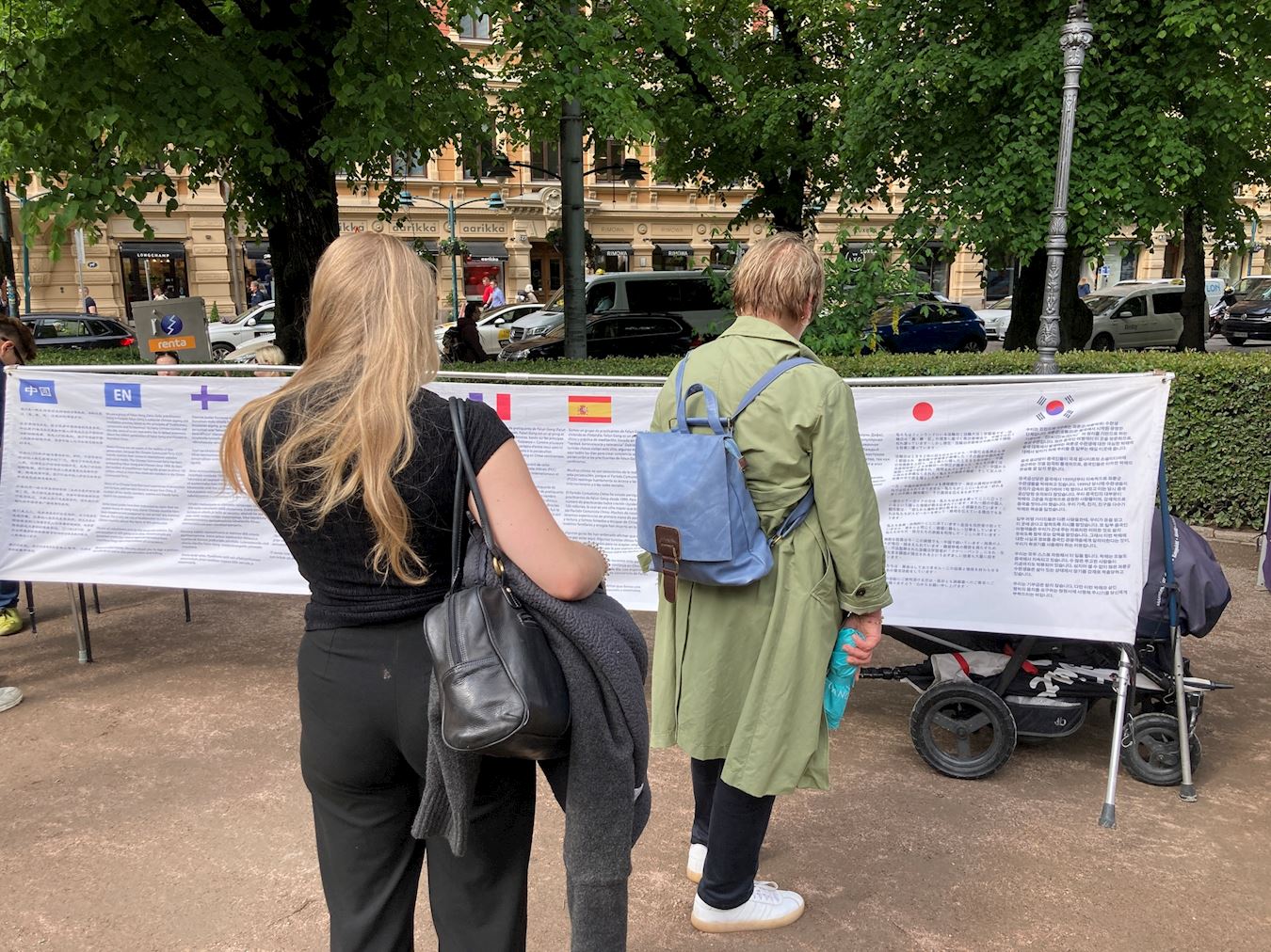 Jedna penzionerka iz Finske rekla je praktikantima: „Znam za vašu praksu, koja naglašava poboljšanje u razmišljanju. Ovo nije religija, ali vas KPK progoni u Kini. To mi je neverovatno.“ Jedan praktikant je objasnio da Falun Dafa naglašava Istinitost-Blagost-Trpeljivost. Žena je rekla: „Kina je totalitarna zemlja, ali sloboda se ne bi smela uskraćivati. Verujem da svako ima pravo da izabere svoj put.“ Izrazila je zahvalnost na prilici da sazna više.
