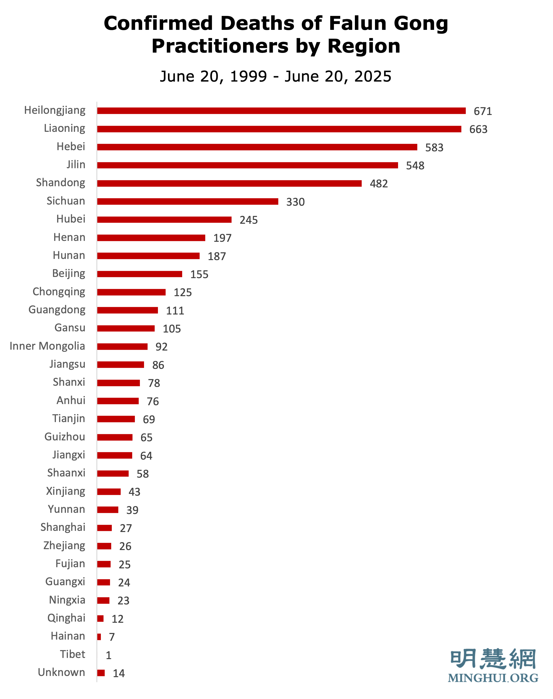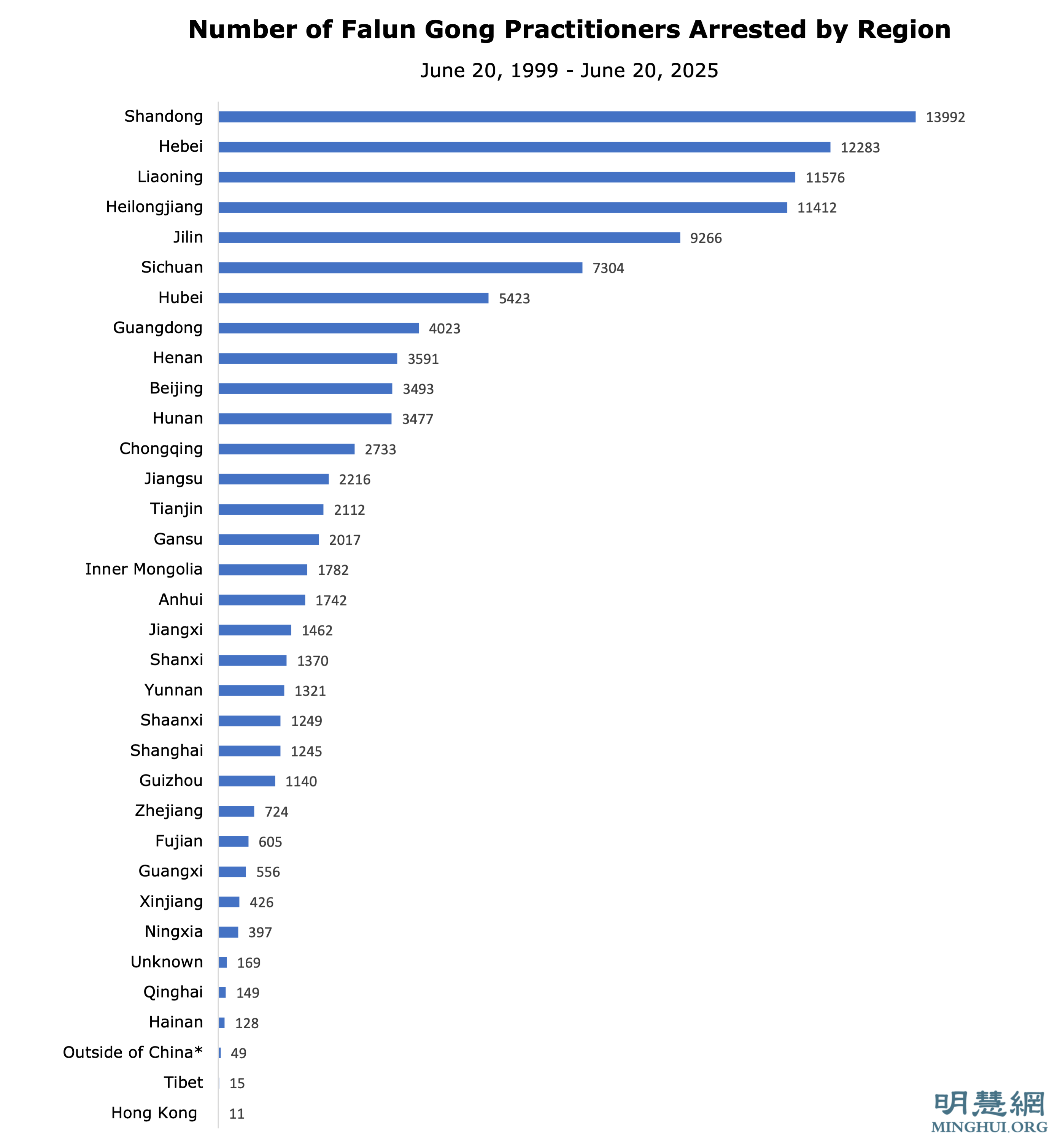 Podaci od 2017. do 2025. preuzeti su iz statističkih izvješća na Minghui.org. Postoje razlike u podacima za 2017.-2023. između ovih izvješća i 25-godišnjeg Minghui izvješća. To je možda doprinijelo nedosljednostima između raščlanjivanja po godinama i regijama.