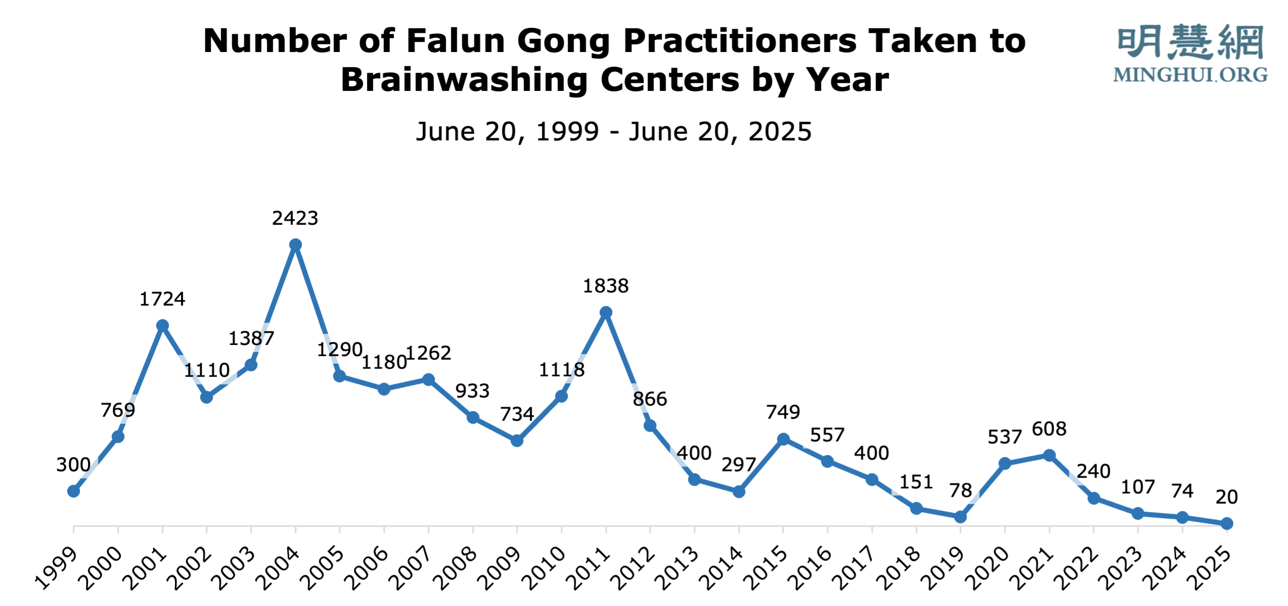 Ovaj članak pruža grupu statističkih podataka o progonu Falun Dafa koje je prikupio Minghui.org između 20. lipnja 1999. i 20. lipnja 2025. Ove brojke omogućuju uvid u cjelokupnu situaciju progona, sposobnost i naporan rad praktikanata u Kini u prikupljanju i prenošenju informacija, kao i rezultate neumornog truda svih praktikanata u suzbijanju progona tijekom proteklih 26 godina. Iz slika 3, 5, 7 i 9 vidimo trend koji ukazuje na to da se progon bliži kraju.