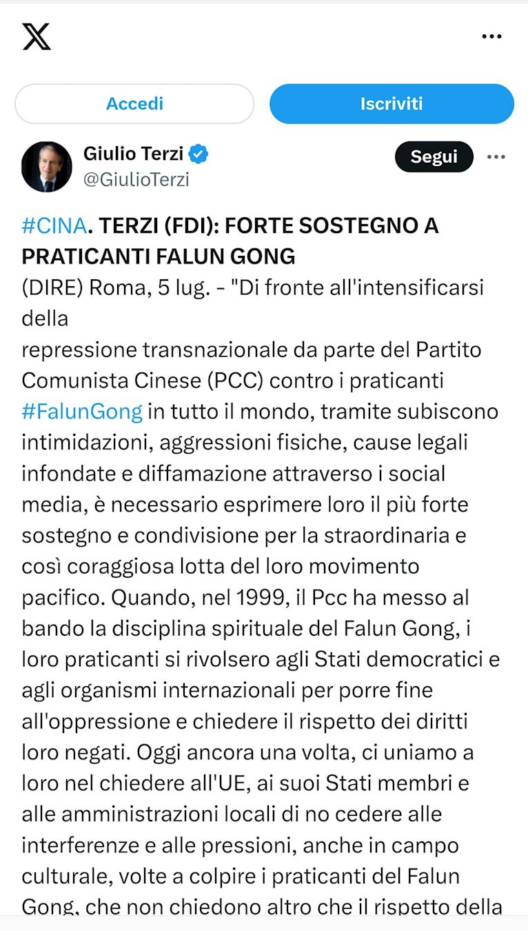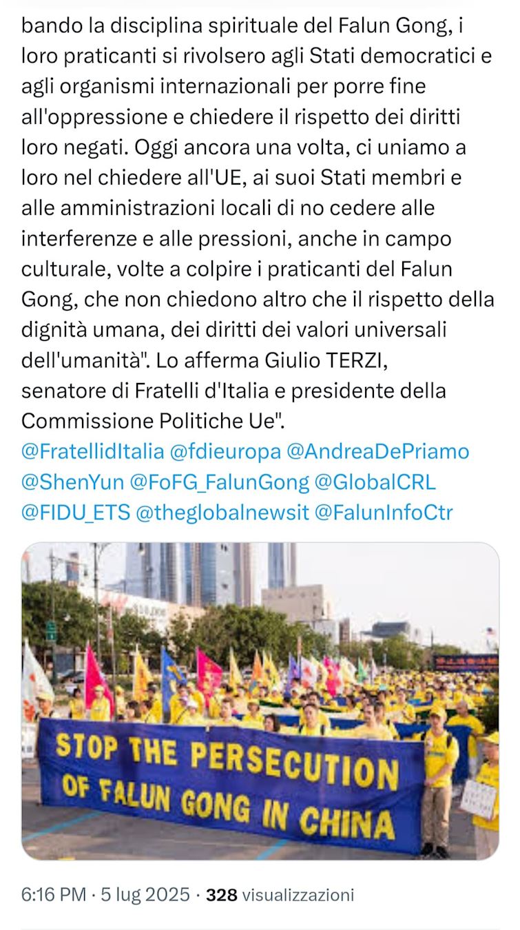 Giulio Terzi, predsjednik 4. Stalnog senatskog odbora za poslove EU-a i senator stranke Braća Italije, izjavio je: „Suočeni s intenziviranjem transnacionalne represije Kineske komunističke partije (KPK) protiv praktikanata Falun Gonga diljem svijeta, koji trpe zastrašivanje, fizičke napade, neutemeljene tužbe i klevetanje putem društvenih medija, potrebno je izraziti našu najsnažniju podršku i suosjećanje s izvanrednom i hrabrom borbom njihovog mirnog pokreta.