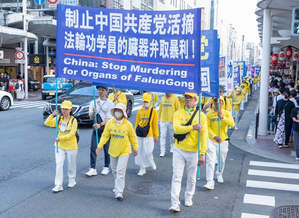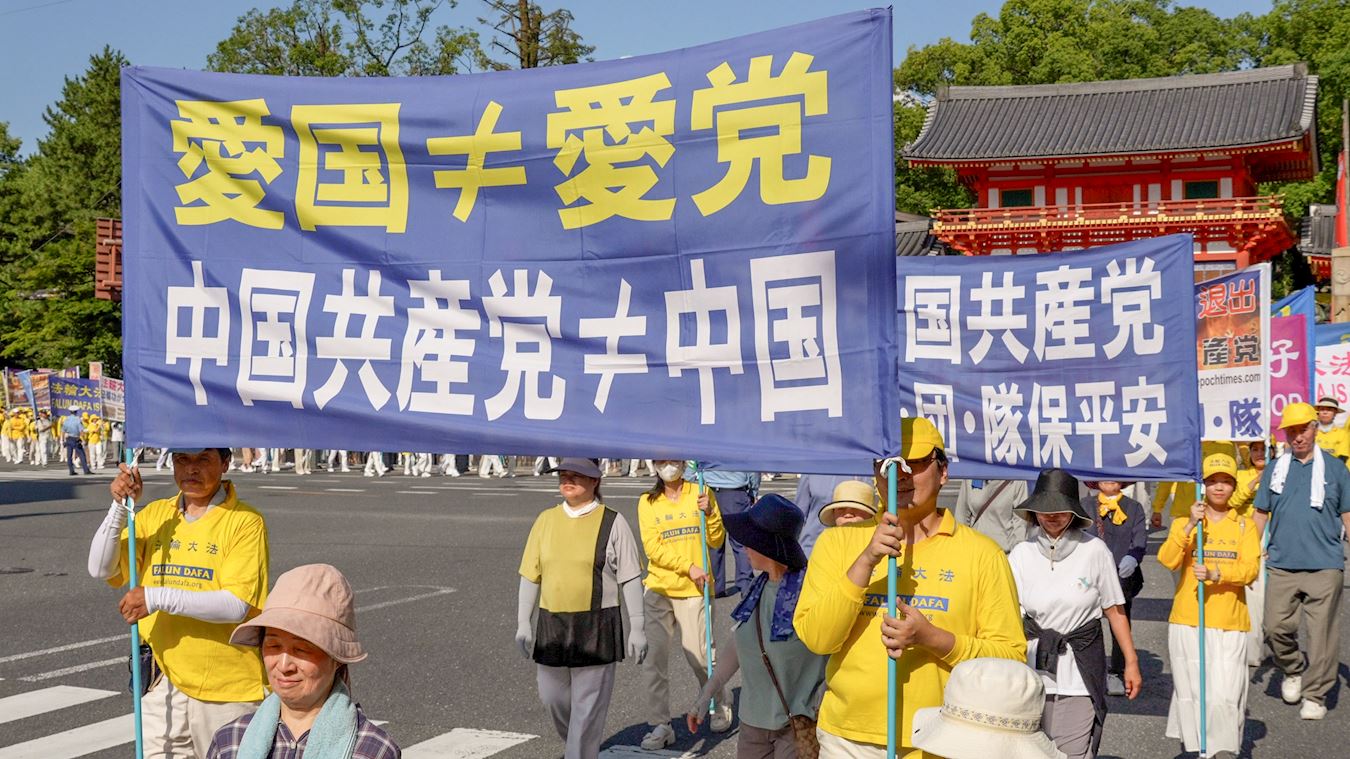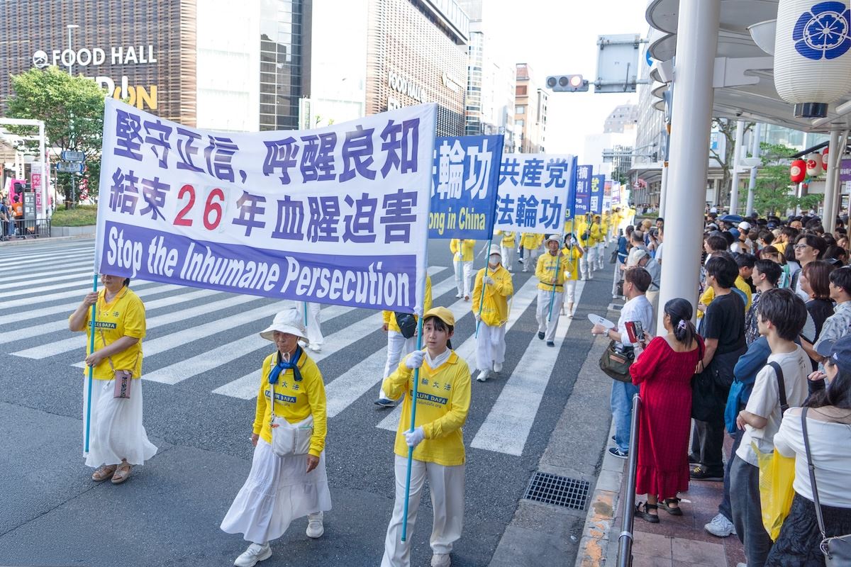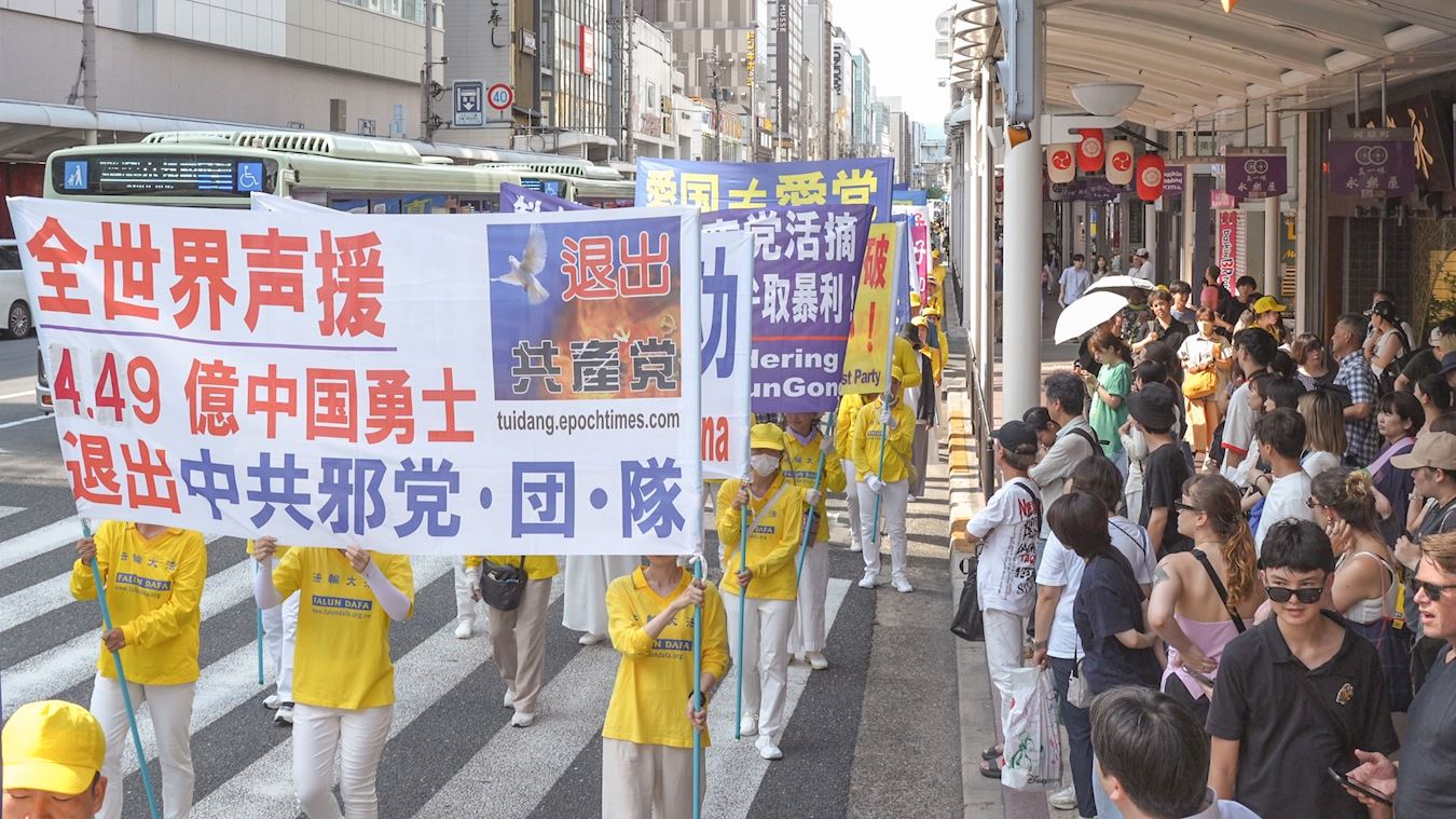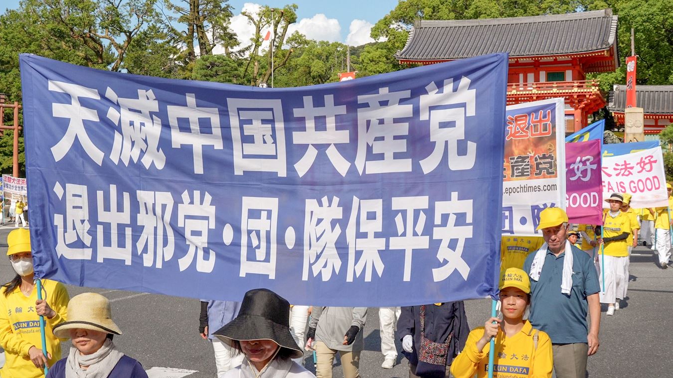 Praktikanti Falun Dafa održali su marš u gradu Kyotu 12. srpnja 2025. kako bi obilježili godišnjicu svog mirnog prosvjeda protiv progona koji sprovodi Komunistička partija Kine (KPK) od 20. srpnja 1999., i kako bi pozvali na njegov prekid.