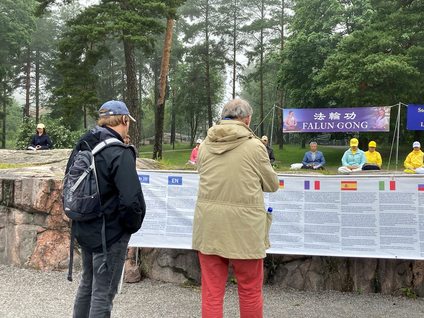 Finski praktikanti su demonstrirali Falun Dafa vježbe i dijelili informativne letke na dan 6. srpnja 2025. u parku Sibelius, poznatoj turističkoj atrakciji na zapadnoj obali Helsinkija. Njihovo grupno vježbanje ispred velikih transparenata privuklo je brojne turiste koji su saznali o progonu Falun Dafa u Kini i potpisali peticiju kojom se poziva na njegov završetak.