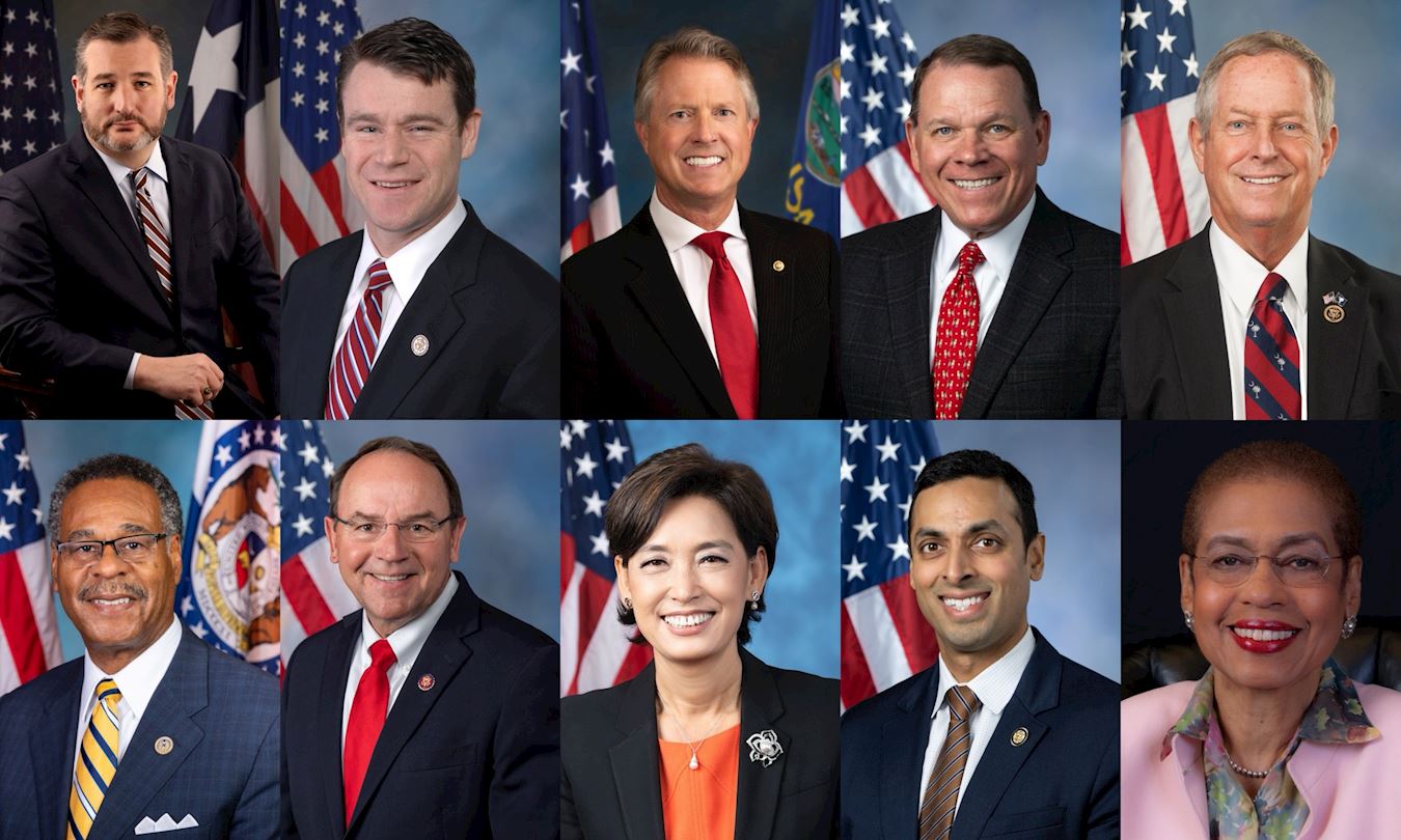 Slijeva nadesno i odozgo prema dolje: Senator Ted Cruz iz Teksasa, senator Todd Young iz Indiane, senator Roger Marshall iz Kanzasa, zastupnik Sam Graves iz Missourija, zastupnik Joe Wilson iz Južne Karoline, zastupnik Emanuel Cleaver II iz Missourija, zastupnik Thomas Tiffany iz Wisconsina, zastupnica Young Kim iz Kalifornije, zastupnik Suhas Subramanyam iz Virginije i senatorka Eleanor Holmes Norton iz Washingtona, D.C.