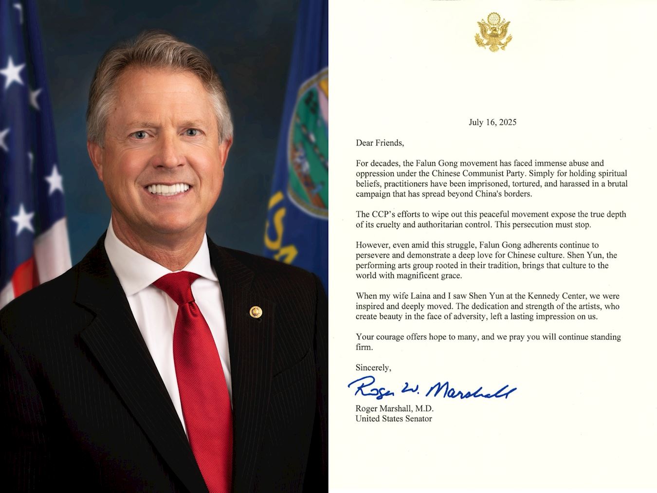 Senator Roger Marshall iz Kanzasa je u svom pismu napisao: „Decenijama se pokret Falun Gong suočava s ogromnim zlostavljanjem i ugnjetavanjem od strane Komunističkom partijom Kine. Jednostavno zbog njihovih duhovnih uvjerenja, praktikanti su zatvarani, mučeni i maltretirani u brutalnoj kampanji koja se proširila izvan granica Kine.”