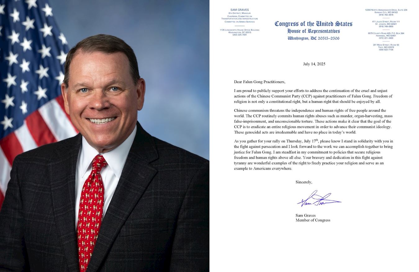 Zastupnik Sam Graves iz Missourija je u svom pismu napisao: „Ponosan sam što javno podržavam vaše napore da se pozabavite nastavkom okrutnih i nepravednih postupaka KPK protiv praktikanata Falun Gonga. Sloboda vjeroispovijesti nije samo ustavno pravo, već ljudsko pravo koje bi svi trebali uživati.