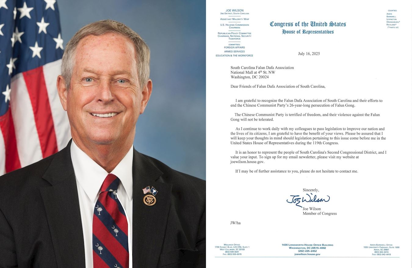 Republikanski zastupnik Joe Wilson je u svom pismu napisao: „Zahvalan sam što mogu odati priznanje Falun Dafa udruženju Južne Karoline i njihovim naporima da okončaju 26-godišnji progon Falun Gonga od strane Komunističke partije Kine.
