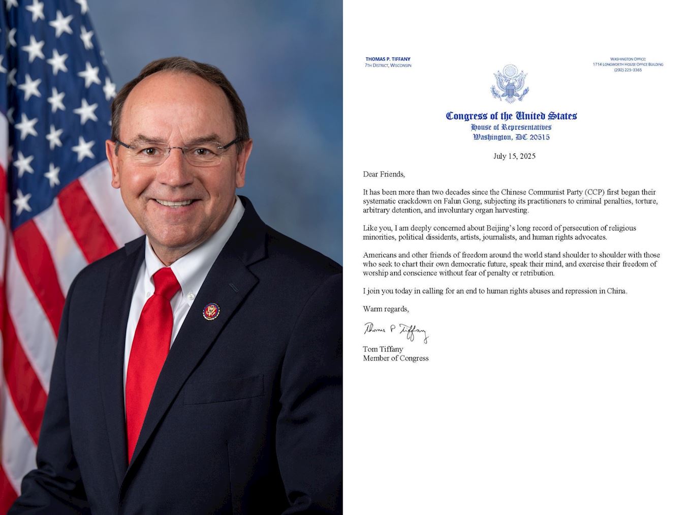 Republikanski zastupnik Thomas Tiffany je u svom pismu napisao: „Prošlo je više od dvije decenije otkako je KPK prvi put započela svoj sistematski obračun s Falun Gongom, podvrgavajući njegove praktikante krivičnim kaznama, mučenju, proizvoljnom pritvaranju i prisilnoj žetvi organa.