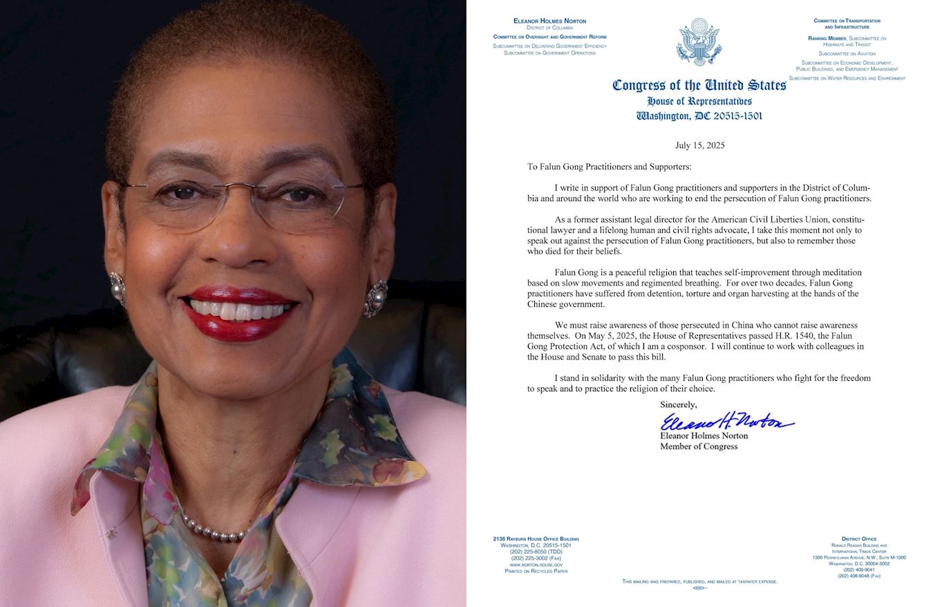 Demokratska kongresmenka Eleanor Holmes Norton je u svom pismu napisala: „Pišem u znak podrške praktikantima i pristalicama Falun Gonga u Distriktu Columbia i širom svijeta koji rade na okončanju progona praktikanata Falun Gonga.”