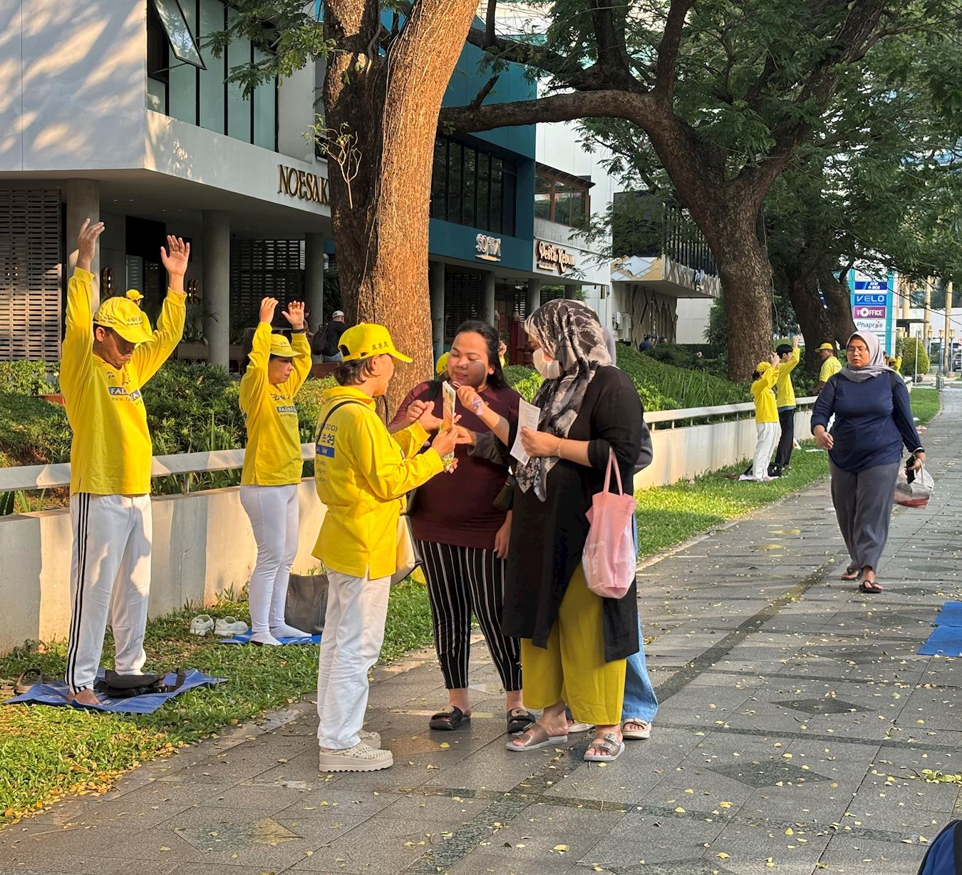 Aktivnost je započela grupnim vežbama. Mnogi prolaznici su se zaustavljali da posmatraju, prihvatali su informativne materijale i saznavali više o teškim kršenjima ljudskih prava koja se još uvek dešavaju u Kini. Nekoliko njih je pohvalilo praktikante za njihove mirne i dostojanstvene napore da podignu svest i traže pravdu.svest i traže pravdu.