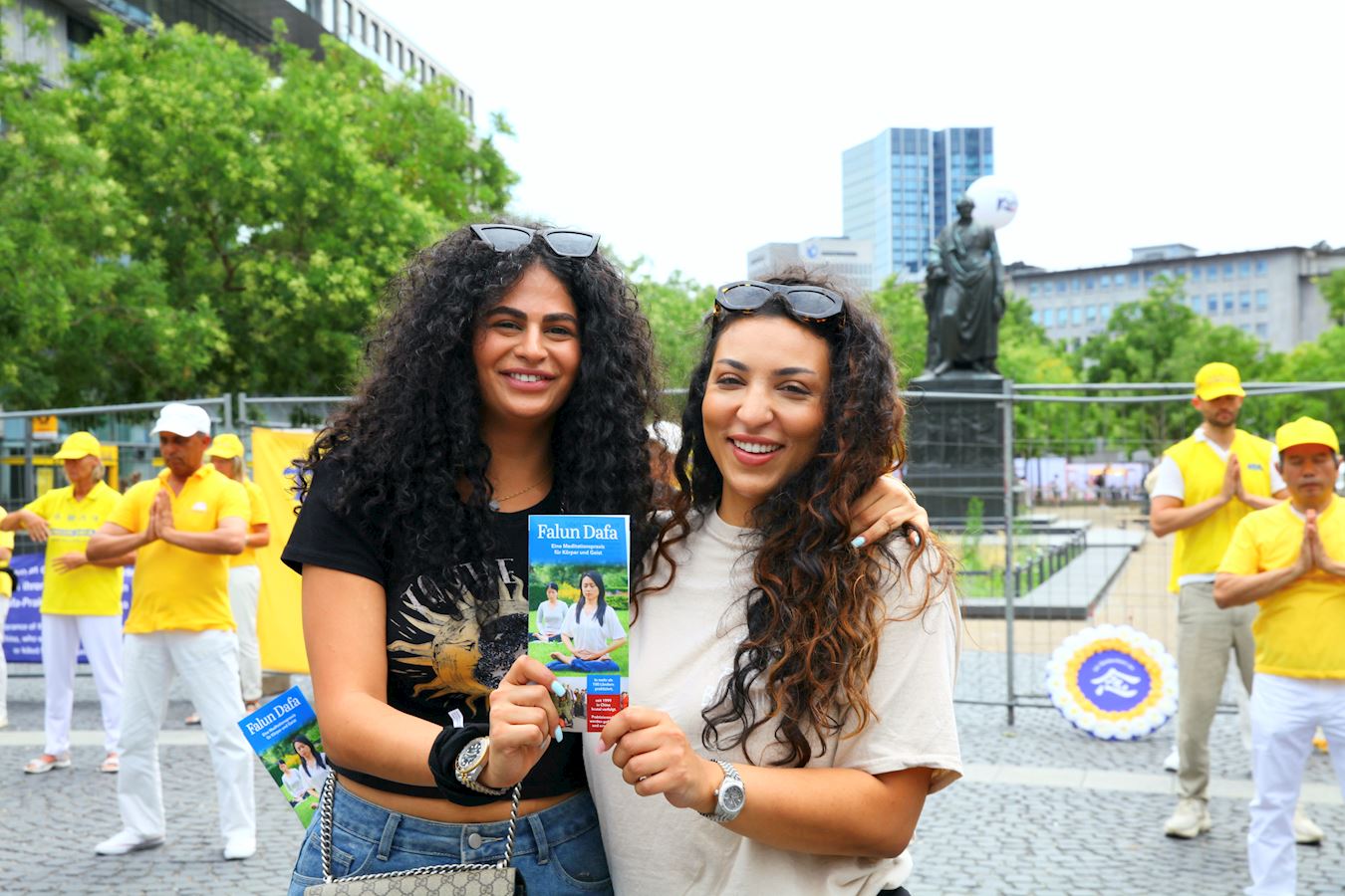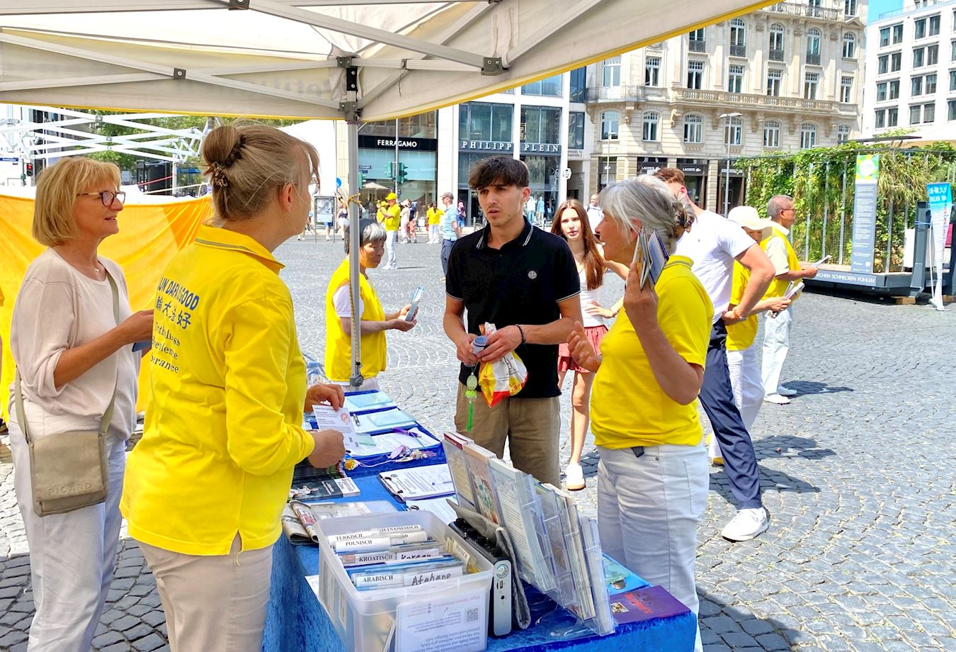 Praktikanti Falun Gonga iz Frankfurta i okolnih područja privukli su pažnju prolaznika na Geteplacu u centru grada. Neki su zastali da gledaju demonstraciju vežbi praktikanata, dok su drugi slušali govore na skupu ili razgovarali sa praktikantima. Želeli su da saznaju šta je Falun Gong, zašto ga KPK progoni i kako da pomognu praktikantima da okončaju progon. Neki ljudi su potpisali peticiju kojom se poziva na okončanje progona.