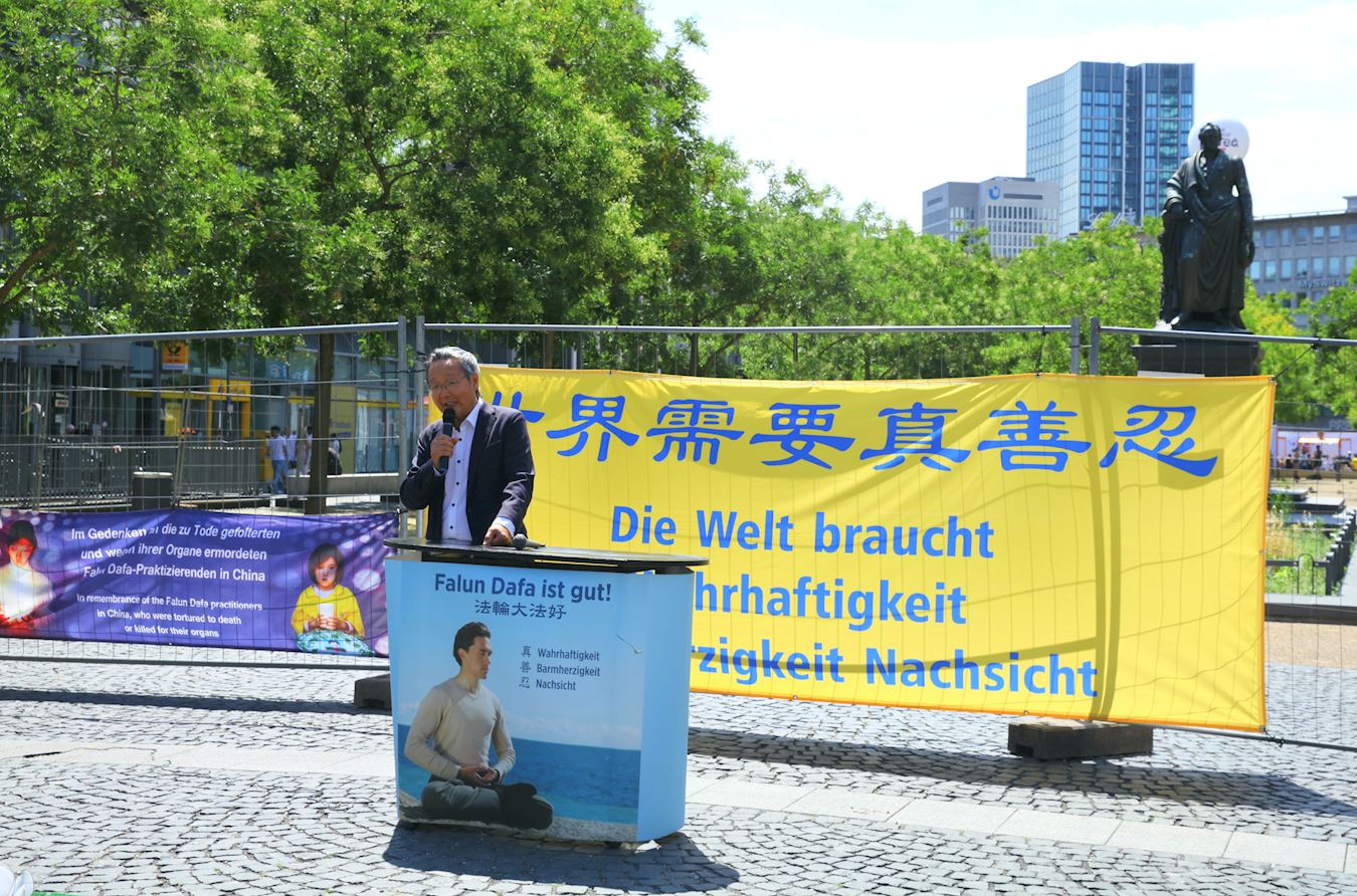 Praktikanti Falun Gonga održali su skup u Frankfurtu, Nemačka, 19. jula 2025, da bi mirno protestovali protiv 26-godišnjeg progona od strane Komunističke partije Kine (KPK). Takođe su pozvali na raspad KPK. Michael Gahler, poslanik Evropskog parlamenta (MEP), i Vu Manjang, stručnjak za Kinu, bili su prisutni da izraze svoju podršku. Neki praktikanti su opisali svoja iskustva progona od strane KPK u Kini.