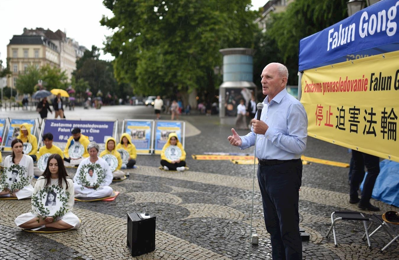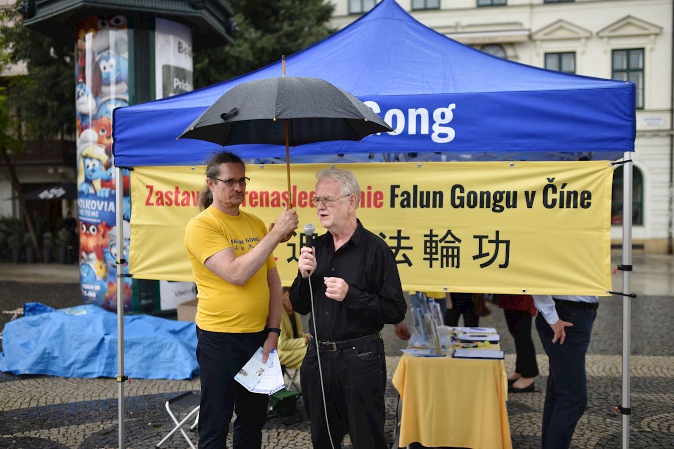 Peter Osuský, bivši zastupnik Nacionalnog vijeća Slovačke Republike, započeo je svoj govor osvrćući se na mirne prosvjede kojima se želi skrenuti pozornost na progon Falun Gonga od strane KPK, a koji se već godinama održavaju ispred kineskog veleposlanstva u Bratislavi, ali progon se nastavlja.
