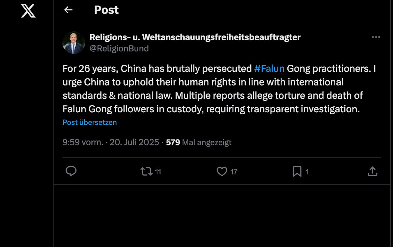 Savezni poslanik Tomas Rahel objavio je na platformi X 20. jula: „Kina već 26 godina brutalno progoni Falun Gong praktikante. Pozivam Kinu da poštuje njihova ljudska prava u skladu sa međunarodnim standardima i nacionalnim zakonima. Više izveštaja navodi mučenje i smrt sledbenika Falun Gonga u pritvoru, što zahteva transparentnu istragu.“