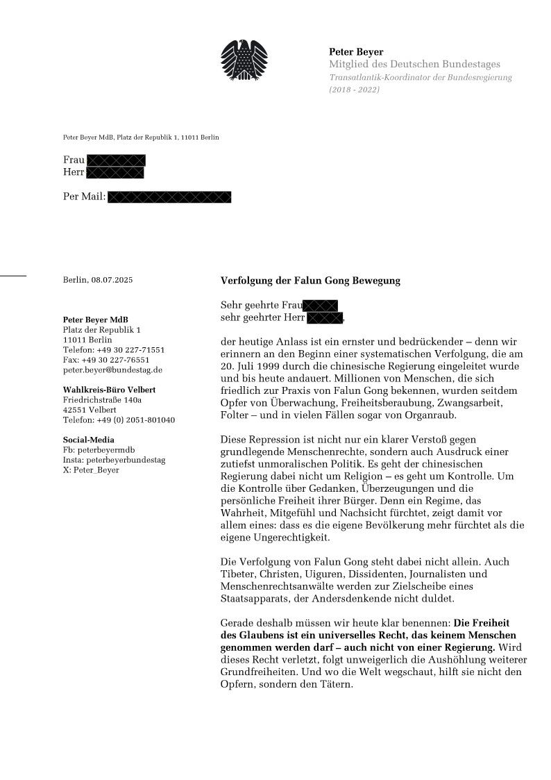 Savezni poslanik Peter Bajer je u svom pismu naveo: „Današnja prilika je ozbiljna i uznemirujuća – jer se sećamo početka sistematskog progona koji je kineska vlada pokrenula 20. jula 1999. i koji traje do danas. Milioni ljudi koji mirno praktikuju Falun Gong od tada su postali žrtve nadzora, lišavanja slobode, prisilnog rada, mučenja – a u mnogim slučajevima čak i vađenja organa.“