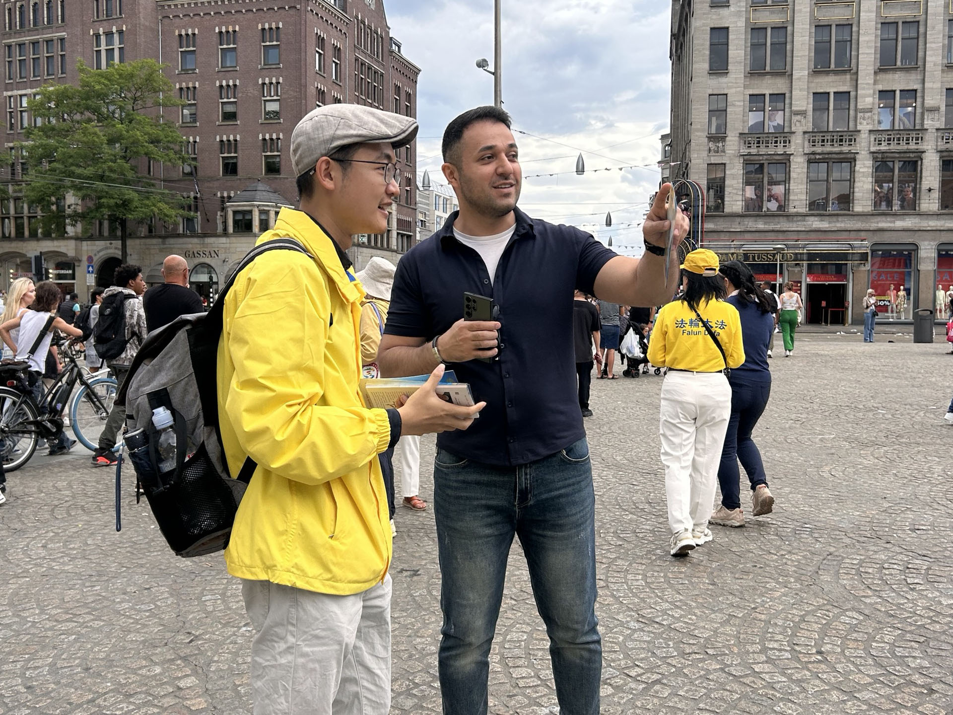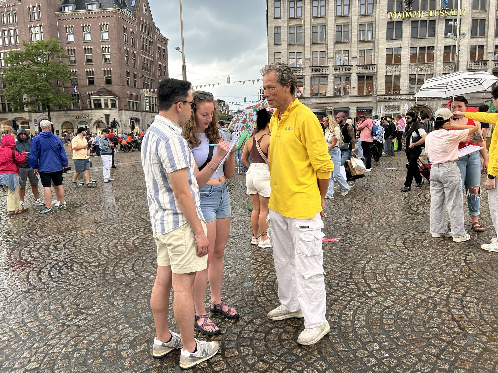 Falun Gong praktikanti iz cijele Holandije su se okupili na Trgu Dam u glavnom gradu Amsterdamu 20. jula 2025. godine. Oni su demonstrirali vježbe, govorili ljudima o progonu, prikupljali potpise za peticiju i odali počast kolegama praktikantima koji su izgubili živote tokom progona od strane Komunističke partije Kine (KPK). Pozvali su KPK da okonča svoju 26-godišnju kampanju progona, diskriminacije, torture i transnacionalne represije nad Falun Gong.