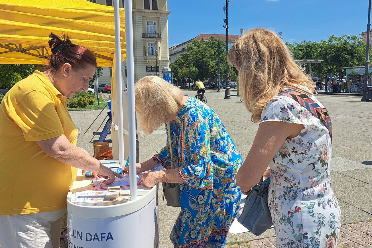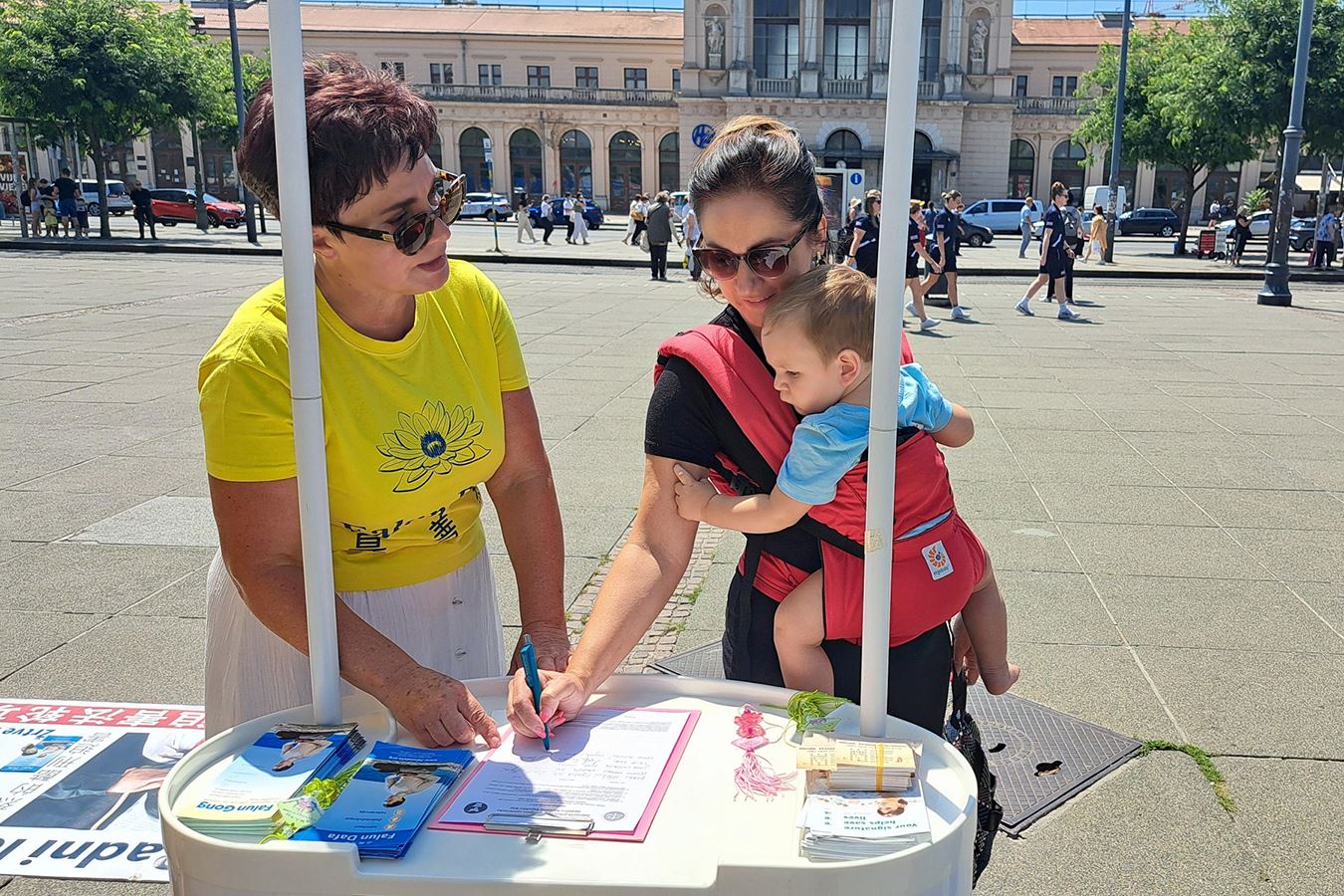 Mnogi su ljudi vidjeli transparente Falun Gonga i odmah su otišli do štanda pitati kako mogu pomoći praktikantima da prekinu progon. Nadina, učiteljica, koja je nosila bebu, bila je jedna od njih. Praktikantica joj je pokazala peticiju i ona ju je odmah potpisala. Rekla je praktikantici: „Trebamo potpisati peticiju kako bi podržali i zaustavili ovu vrstu progona.“