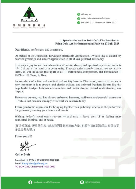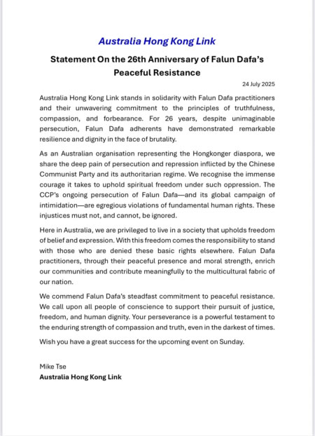 U pismu koje je stiglo od Australia Hong Kong Linka stoji: „Australia Hong Kong Link stoji solidarno s Falun Dafa praktikantima i njihovom nepokolebljivom posvećenošću principima Istinitosti, Dobrodušnosti i Tolerancije. Već 26 godina, uprkos nezamislivom progonu, Falun Dafa sljedbenici su pokazali izuzetnu otpornost i dostojanstvo suočeni s brutalnošću.
