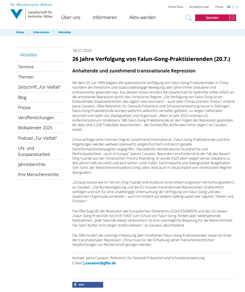 „Ovom prilikom, Društvo za ugrožene narode želi da skrene pažnju na kontinuiranu represiju od strane kineskog režima: ‘Progon praktikanata Falun Gonga je zločin koji traje, koji sprovodi država, i koji svakodnevno uzrokuje patnju — čak i izvan granica Kine,’ izjavila je danas u Getingenu Jasna Čaušević, stručnjak GfbV-a za prevenciju genocida i odgovornost za zaštitu. Praktikanti Falun Gonga se i dalje proizvoljno hapse, muče, osuđuju na dugotrajne zatvorske kazne, podvrgavaju prinudnom radu i koriste kao izvor organa za transplantaciju: ‘Prema američkom Stejt departmentu, samo u 2023. godini, najmanje 188 praktikanata Falun Gonga umrlo je kao posledica represije. Ukupno je dokumentovano 5.238 smrtnih slučajeva — ali je broj neprijavljenih slučajeva verovatno daleko veći,’ dodala je Čaušević.