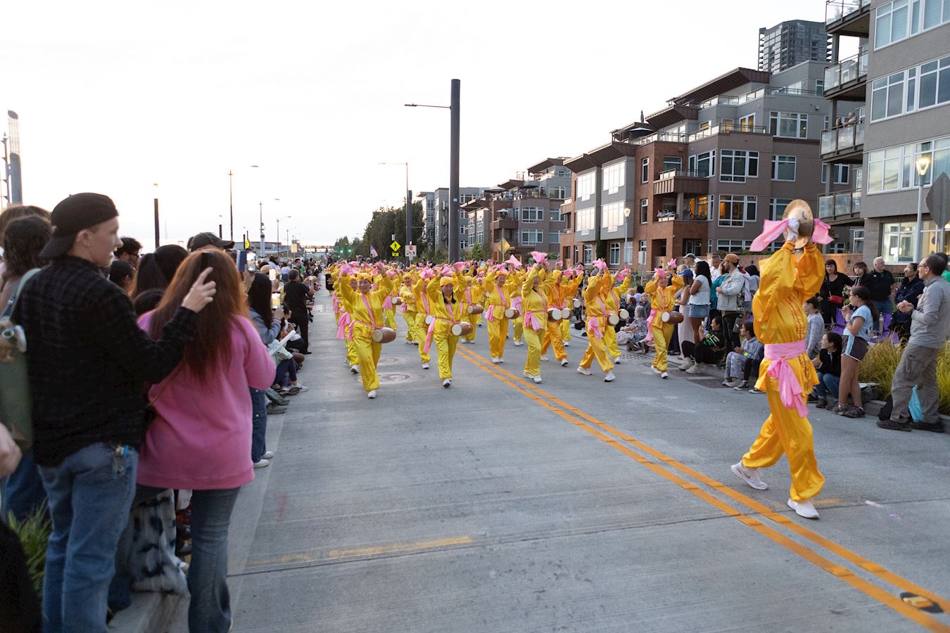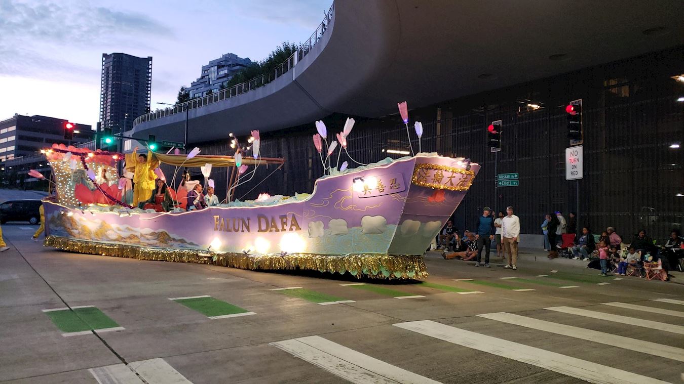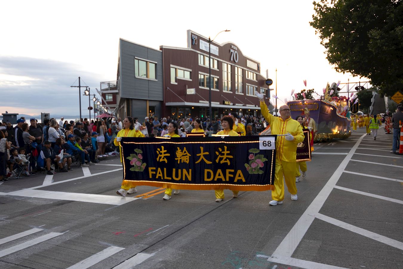 Godišnja Seafair parada sa bakljadom je održana u Seattleu uvečer 26. jula 2025. Hiljade ljudi se poredalo duž ulica da je lično gleda, dok su je hiljade drugih gledale uživo na televiziji ili na internetu. Falun Dafa praktikanti iz Seattlea i Vancouvera su se vozili na splavu koji su sami napravili, svirali su doboše i nosili transparente tokom parade..