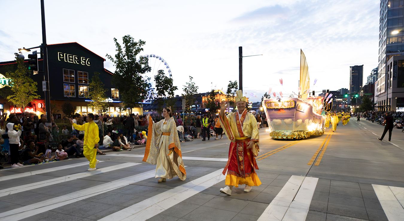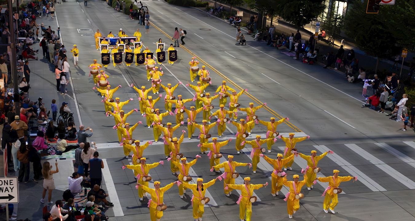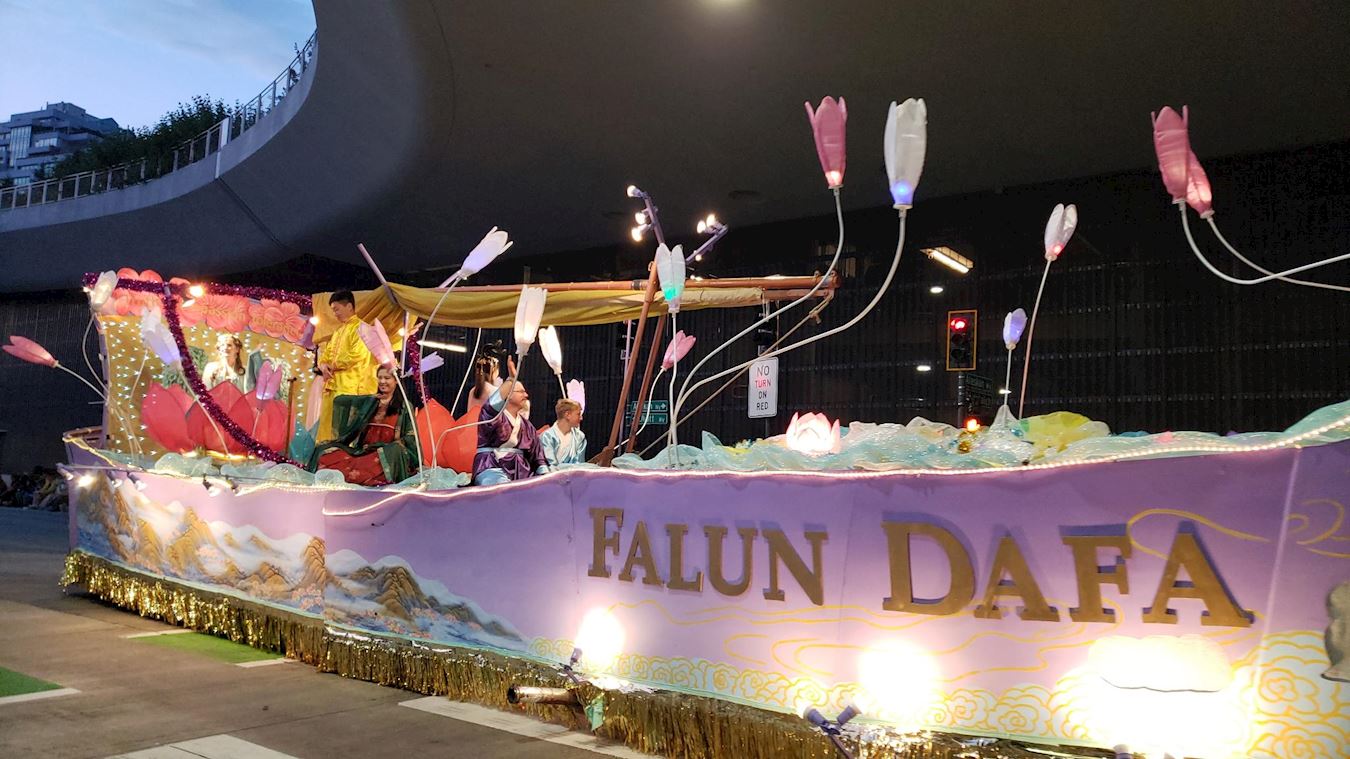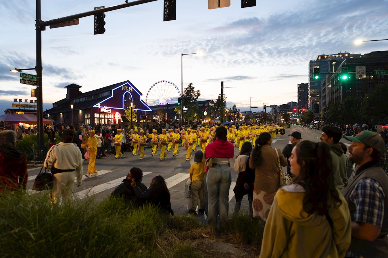 Godišnja Seafair parada sa bakljadom je održana u Seattleu uvečer 26. jula 2025. Hiljade ljudi se poredalo duž ulica da je lično gleda, dok su je hiljade drugih gledale uživo na televiziji ili na internetu. Falun Dafa praktikanti iz Seattlea i Vancouvera su se vozili na splavu koji su sami napravili, svirali su doboše i nosili transparente tokom parade..