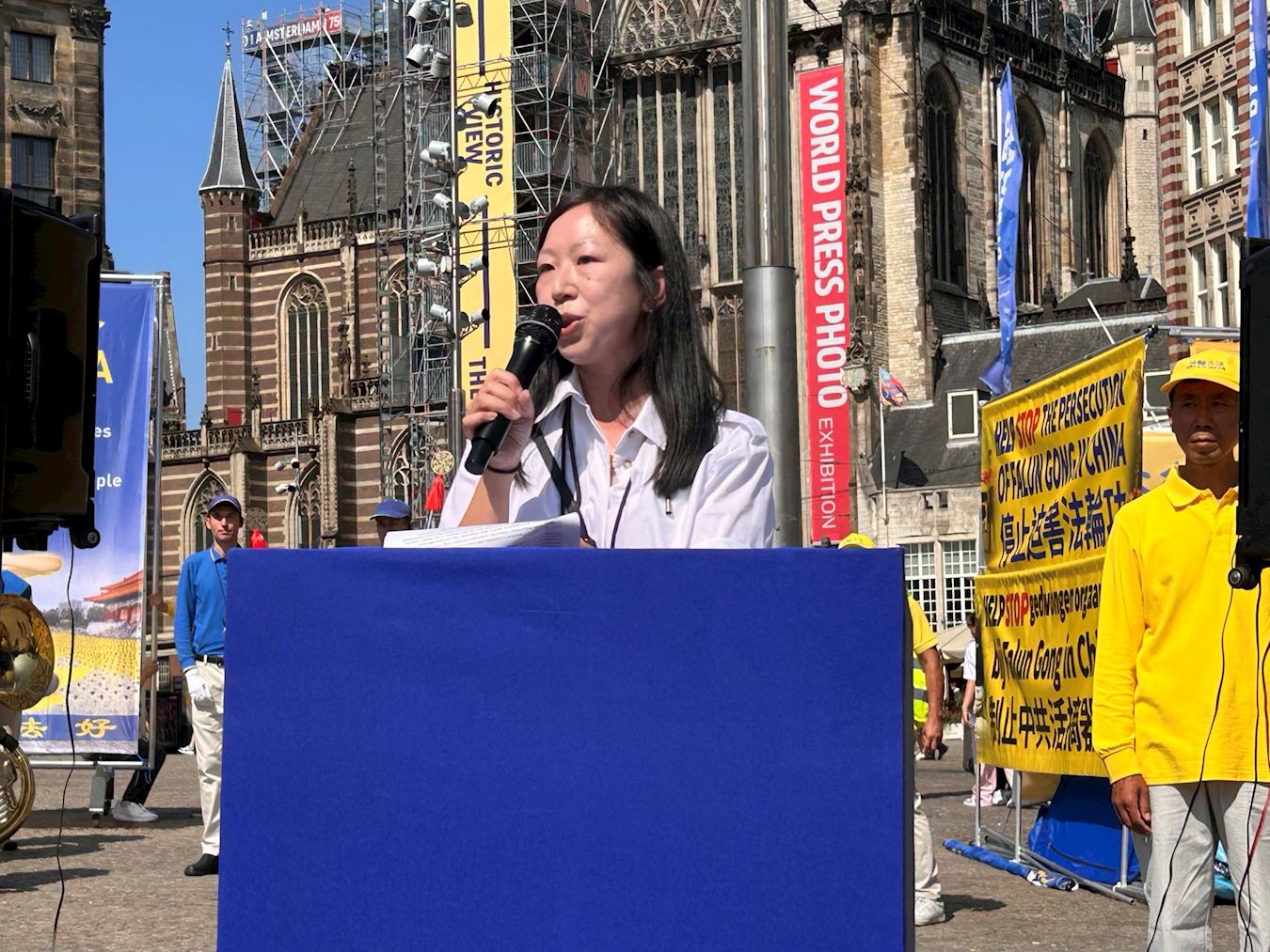 Gđa KaYan Wong, direktorica Falun Dafa udruge Nizozemske, obratila se skupu i rekla: „Falun Gong, koji se također naziva Falun Dafa, vodi ljude u kultivaciji prema načelima Istinitosti-Dobrodušnosti-Tolerancije, omogućujući tako da 100 milijuna praktikanata postigne fizičko i mentalno zdravlje te poboljša svoj moralni kvalitet. KPK je 1999. godine počela suzbijati Falun Gong. Progon traje već 26 godina. Praktikante brutalno muče, podvrgavaju ih prisilnoj žetvi organa te su mnogi izgubili svoje živote. KPK je sada proširila progon u inozemstvo, manipulirajući medijima kako bi klevetala i ocrnjivala Falun Gong.“ Pozvala je KPK da odmah zaustavi progon Falun Dafa.