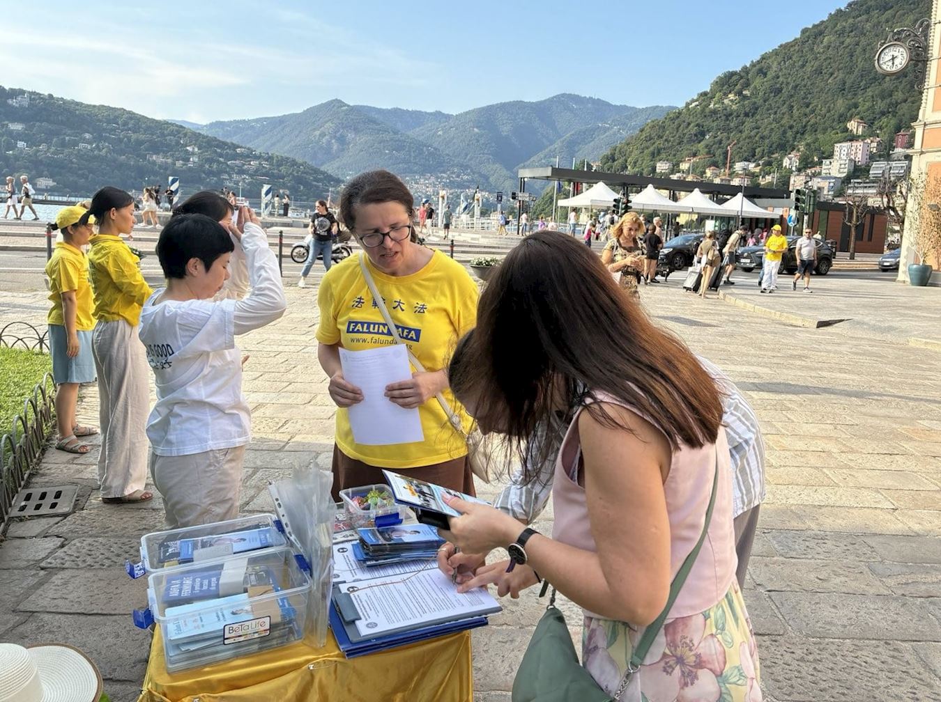 1. avgusta, praktikanti u severnoj Italiji održali su događaj u Komu. U podnožju Alpa, pored Švajcarske i na obali jezera Komo, Komo je još jedna popularna turistička destinacija gde su ljudi sa zadovoljstvom čuli za Falun Dafu..