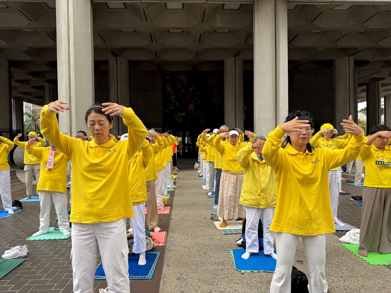 Pored velikog transparenta sa natpisom „Molimo vas, pomozite da zaustavimo transnacionalnu represiju KPK nad Falun Gongom“, mirna scena praktikanata koji tiho meditiraju i vežbaju pružala je kontrast užurbanim gradskim ulicama. Vladini službenici i drugi prolaznici zaustavljali su se da posmatraju i saznaju više o problemu.