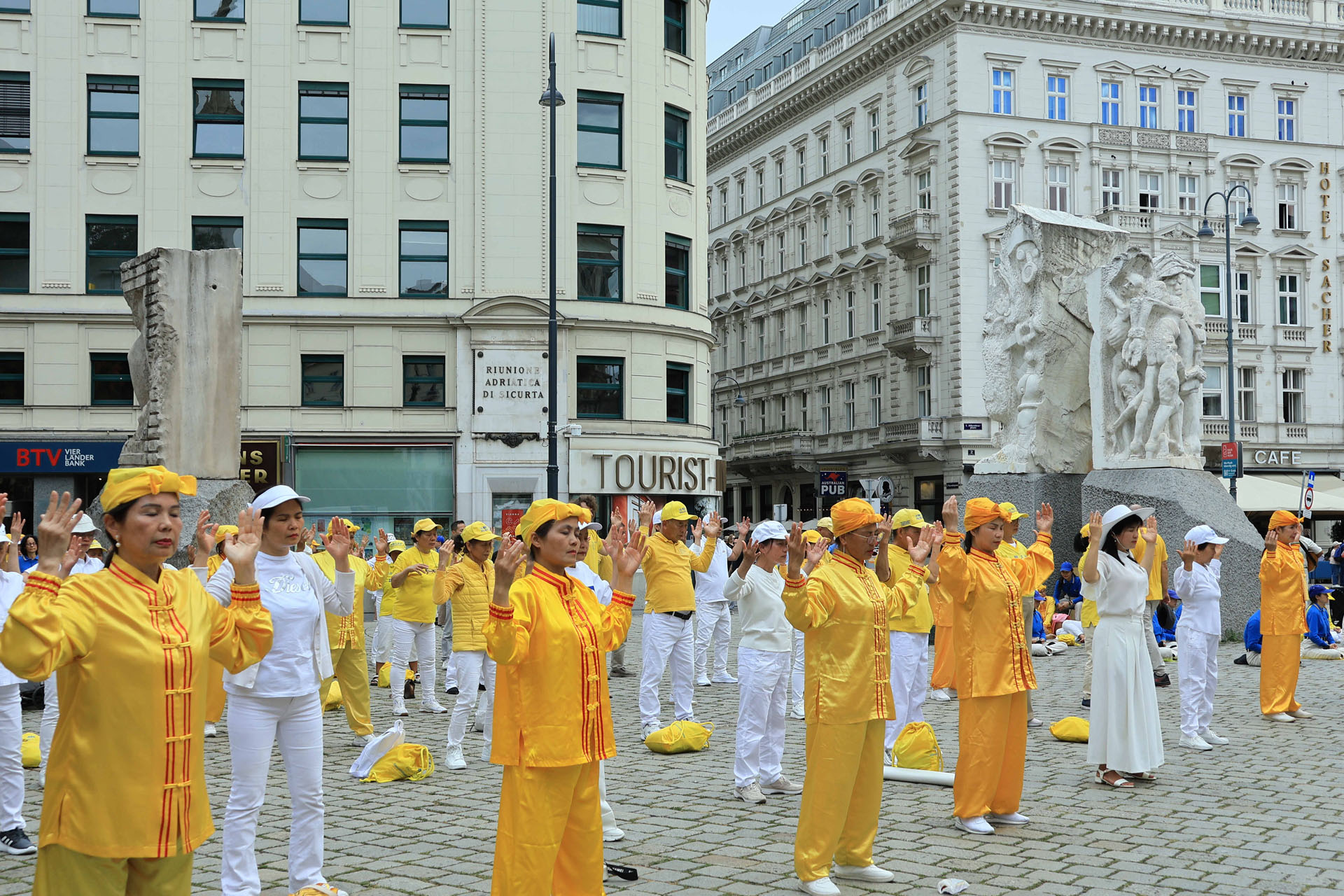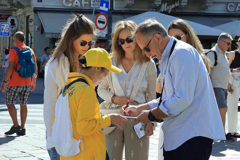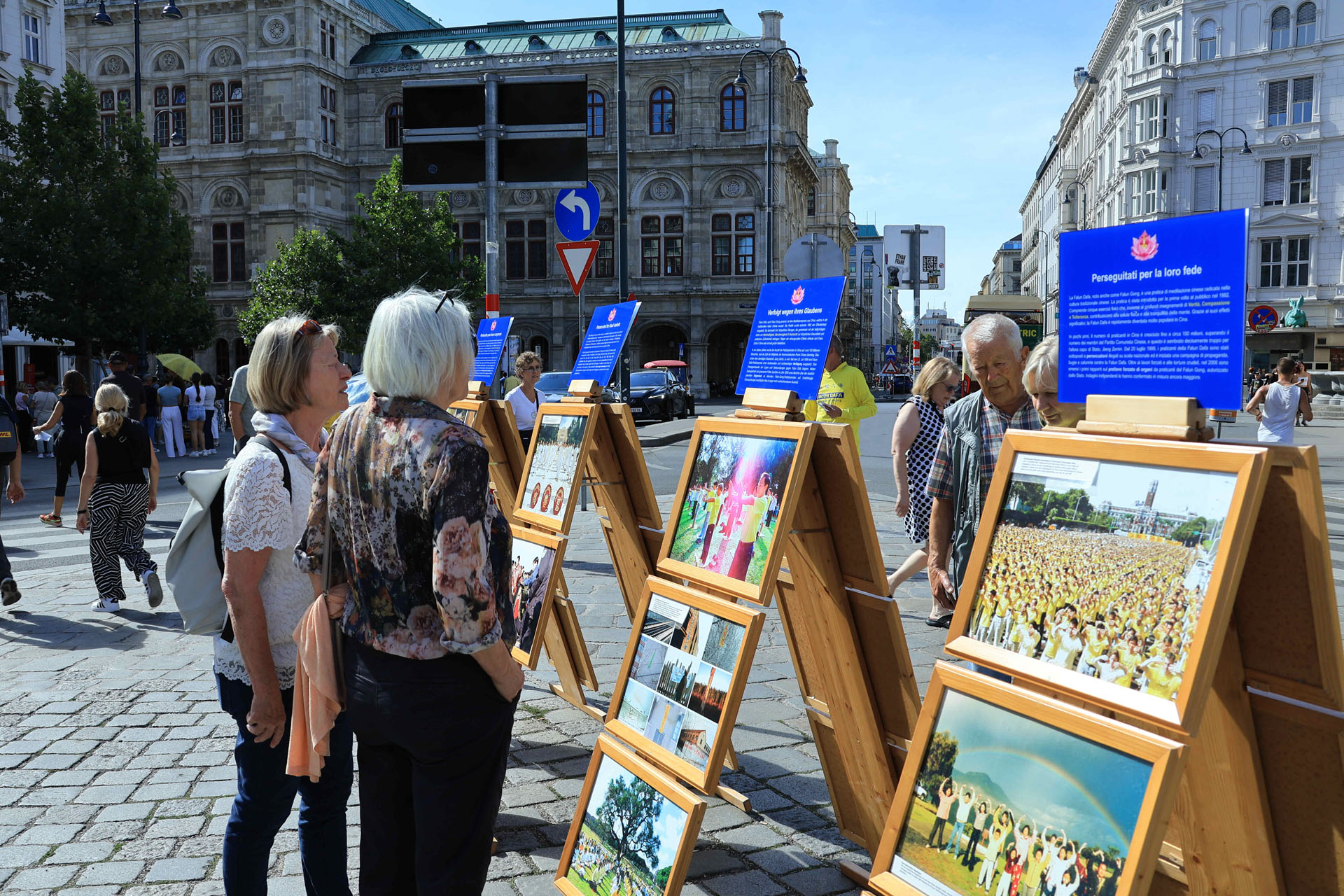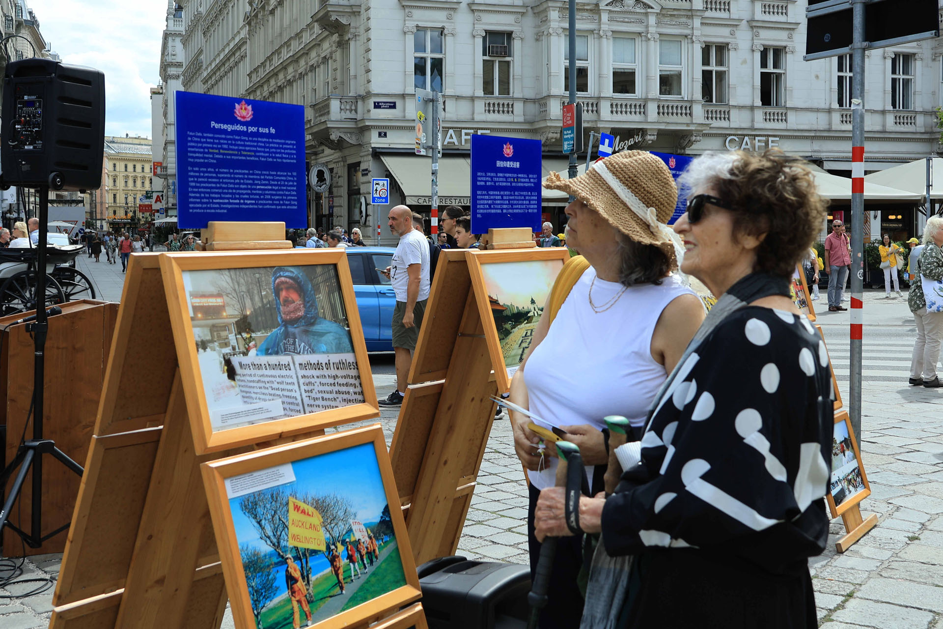 Osim što su ljudima govorili o dobrobitima Falun Dafa, putem plakata i govora na Helmut-Zilk-Platz-u, praktikanti su također objasnili kako KPK proganja praktikante 26 godina.