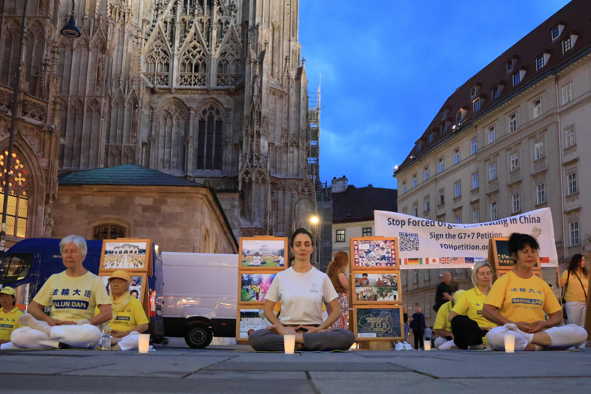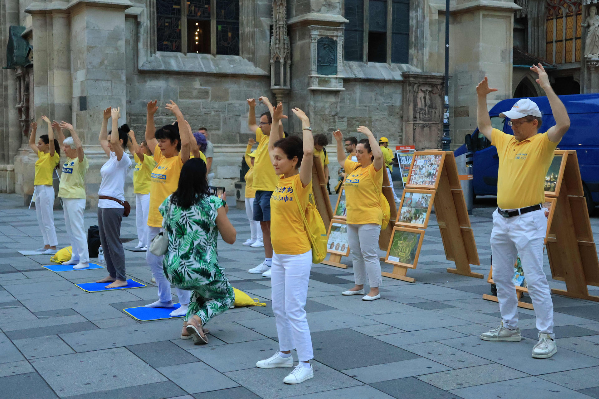 Katedrala Svetog Stefana, koja se uzdiže iznad trga Stephansplatz, je nezaobilazna destinacija za turiste. To je također popularno mjesto gdje se okupljaju mještani i trg je čak prometan i noću. Ljudi koji su prolazili trgom su pažljivo slušali govore praktikanata kako bi saznali o progonu u Kini; neki su uzimali letke i postavljali pitanja; drugi su gledali fotografije koje su prikazivale razne mirne aktivnosti održane tokom proteklih 26 godina kako bi se razotkrile brutalnosti; neki su došli do privlačnog plavog šatora da uzmu više materijala. Ljudi su potpisali peticiju koja poziva Komunističku partiju Kine (KPK) da prestane progoniti Falun Gong i vršiti žetvu organa od njih.