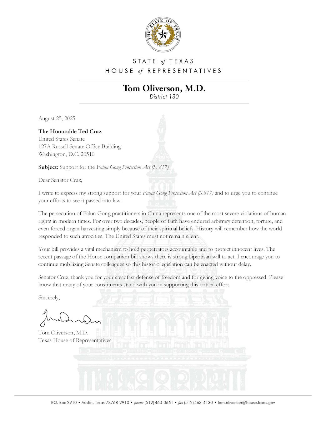 Zastupnik Tom Oliverson je u svom pismu napisao: „Više od dva desetljeća, ljudi od vjere trpe od proizvoljnih pritvaranja, mučenje, pa čak i prisilnog vađenje organa jednostavno zbog svojih duhovnih uvjerenja. Povijest će se sjetiti kako je svijet reagirao na takve grozote. Sjedinjene Američke Države ne smiju ostati tihe.”