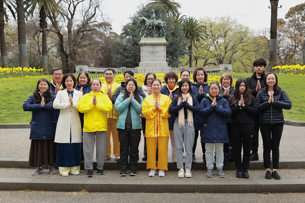 Uoči Praznika sredine jeseni 2025, 6. oktobra, praktikanti Falun Dafe su napravili grupnu fotografiju pored cvetnog sata u baštama kraljice Viktorije u Melburnu. Izrazili su zahvalnost svom osnivaču, Učitelju Li Hongdžiju.