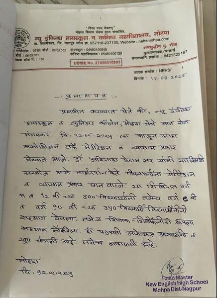 „Ovim se potvrđuje da su u utorak, 12. augusta 2025. godine, u Pratibha višoj osnovnoj i srednjoj školi, Mohpa, Falun Dafa praktikanti vodili Falun Dafa meditaciju i vježbe pod vodstvom dr. Avinasha Gedama.