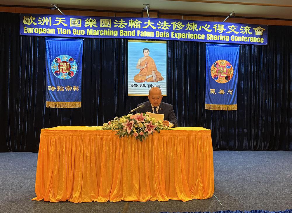 Dva člana benda bila su voditelji konferencije. U svojim uvodnim riječima, rekli su: „Kao članovi marširajućeg orkestra Tian Guo, mi potvrđujemo Fa i spašavamo živa bića kroz muziku. U tom procesu neprestano kultiviramo sebe, oslobađamo se vezanosti, poboljšavamo svoj karakter, radimo zajedno i formiramo jedno tijelo.“