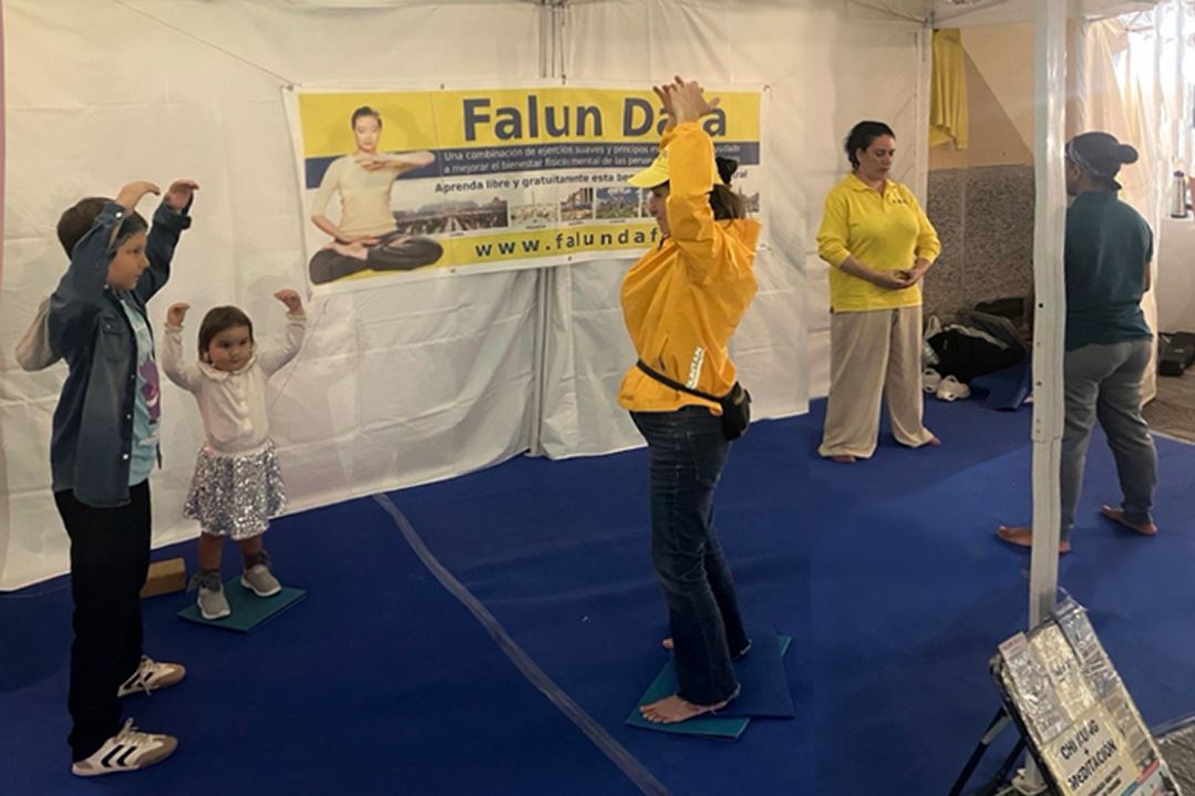 Mnogi prolaznici su se zaustavljali da gledaju kako praktikanti demonstriraju vežbe Falun Dafe uz umirujuću muziku, a neki su odlučili da ih isprobaju. Nekoliko dece se iznova i iznova vraćalo do štanda.