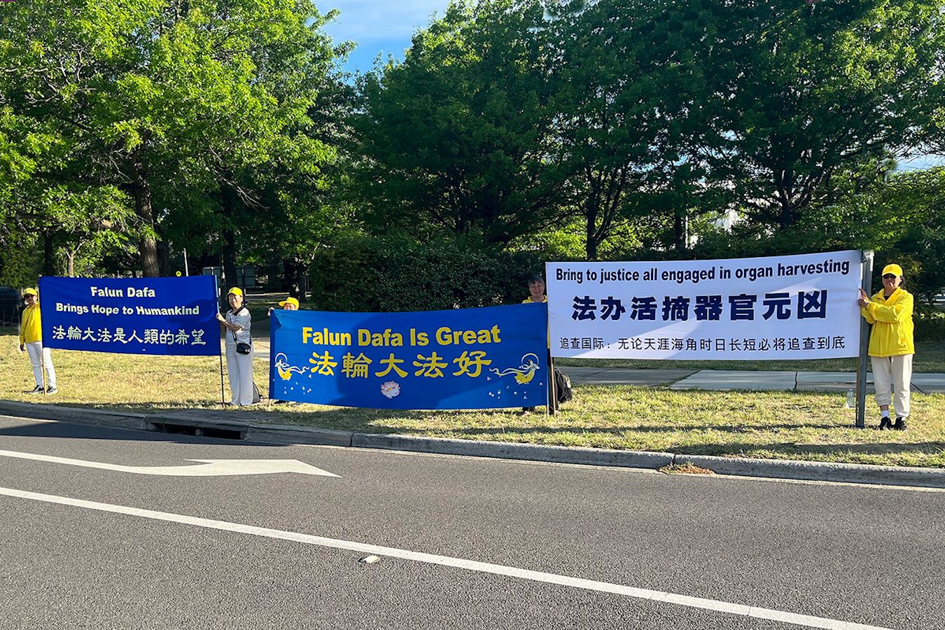 Zhao-va kolona automobila dva je puta prošla pored transparenata praktikanata i čula ih kako viču: „Falun Dafa je dobar“ i „Prestanite progoniti Falun Gong.“