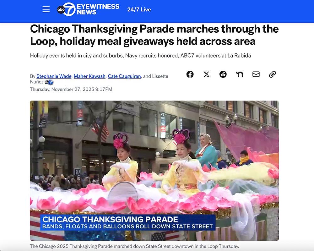 CBS Chicago je prenosio paradu uživo, Pluto TV ju je istovremeno emitovao, a canTV reprizirao, što je uveliko povećalo broj gledalaca parade. CBS Chicago, kao domaćin prenosa uživo, koristio je inserte Falun Dafa nastupa sa parade 2024. u svom trejleru od 34 sekunde.