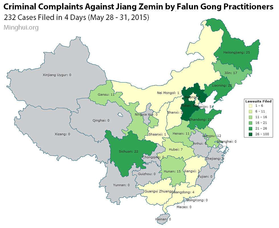 Dok se progon nastavlja, praktikanti sve češće koriste svoje zakonsko pravo da traže pravnu akciju protiv bivšeg diktatora. Između 28. i 31. maja, 2015. godine, praktikanti u Kini su podnijeli najmanje 232 tužbe protiv Jianga. Prema informacijama koje stoje na raspolaganju Minghui-ju, ovi praktikanti predstavljaju 16 pokrajina i općina na nivou pokrajina.