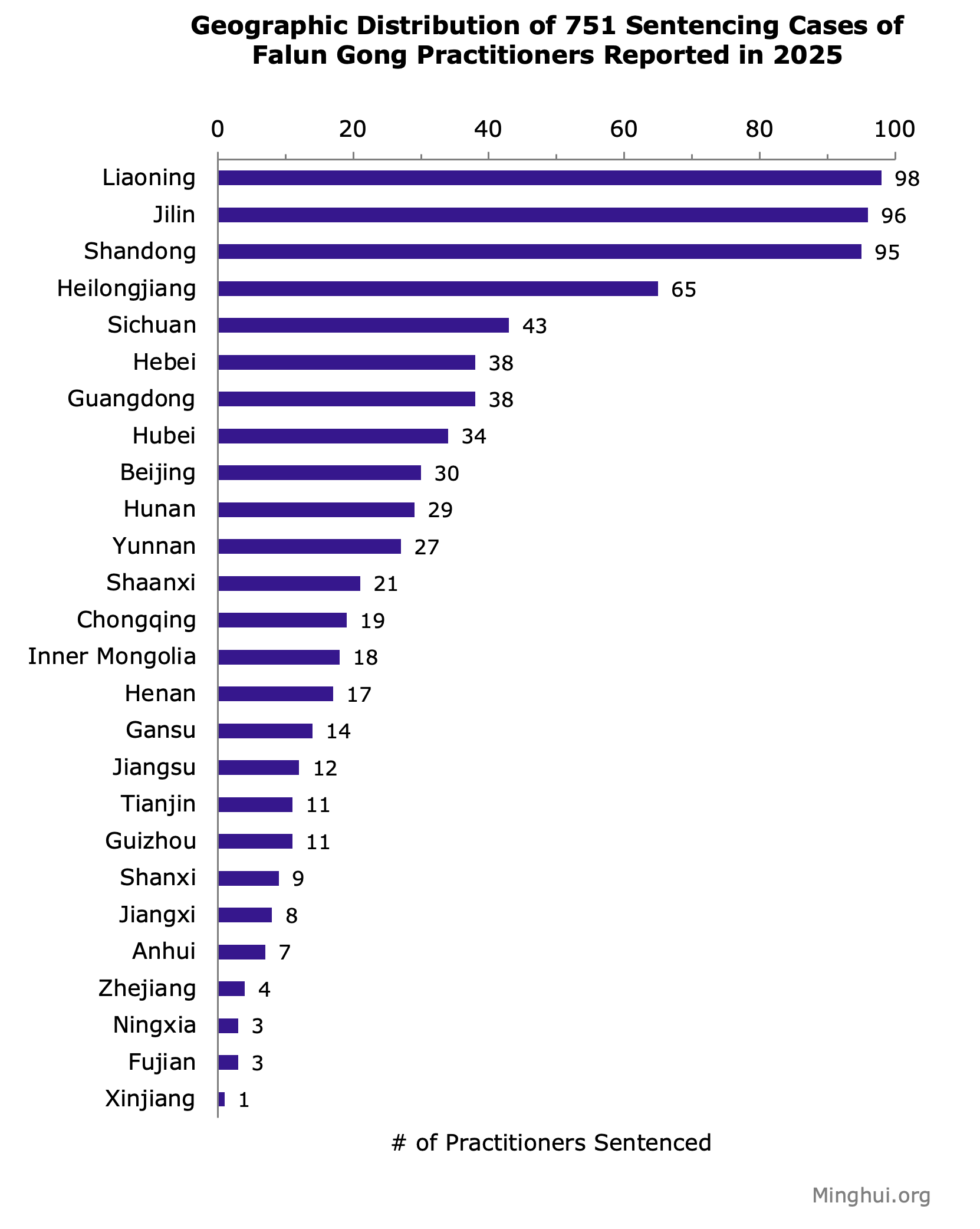 Kina ima 22 provincije, 4 centralno kontrolisane opštine (Peking, Tianjin, Šangaj i Chongqing) i 5 autonomnih regija (Guangxi, Unutrašnja Mongolija, Tibet, Xinjiang i Ningxia). Osim Šangaja, Tibeta, Guangxija, Qinghaija i Hainana, sve ostale 26 jurisdikcija su prijavile slučajeve presuda u 2025. godini. Liaoning, Jilin i Shandong imali su 98, 96 i 95 slučajeva, respektivno. Šesnaest drugih jurisdikcija je također r prijavilo dvocifreni broj slučajeva između 11 i 65, a preostalih sedam regija imalo je jednocifreni broj slučajeva od 1 do 9.