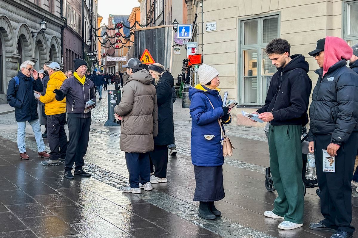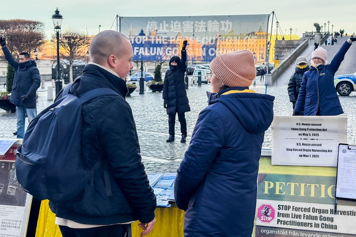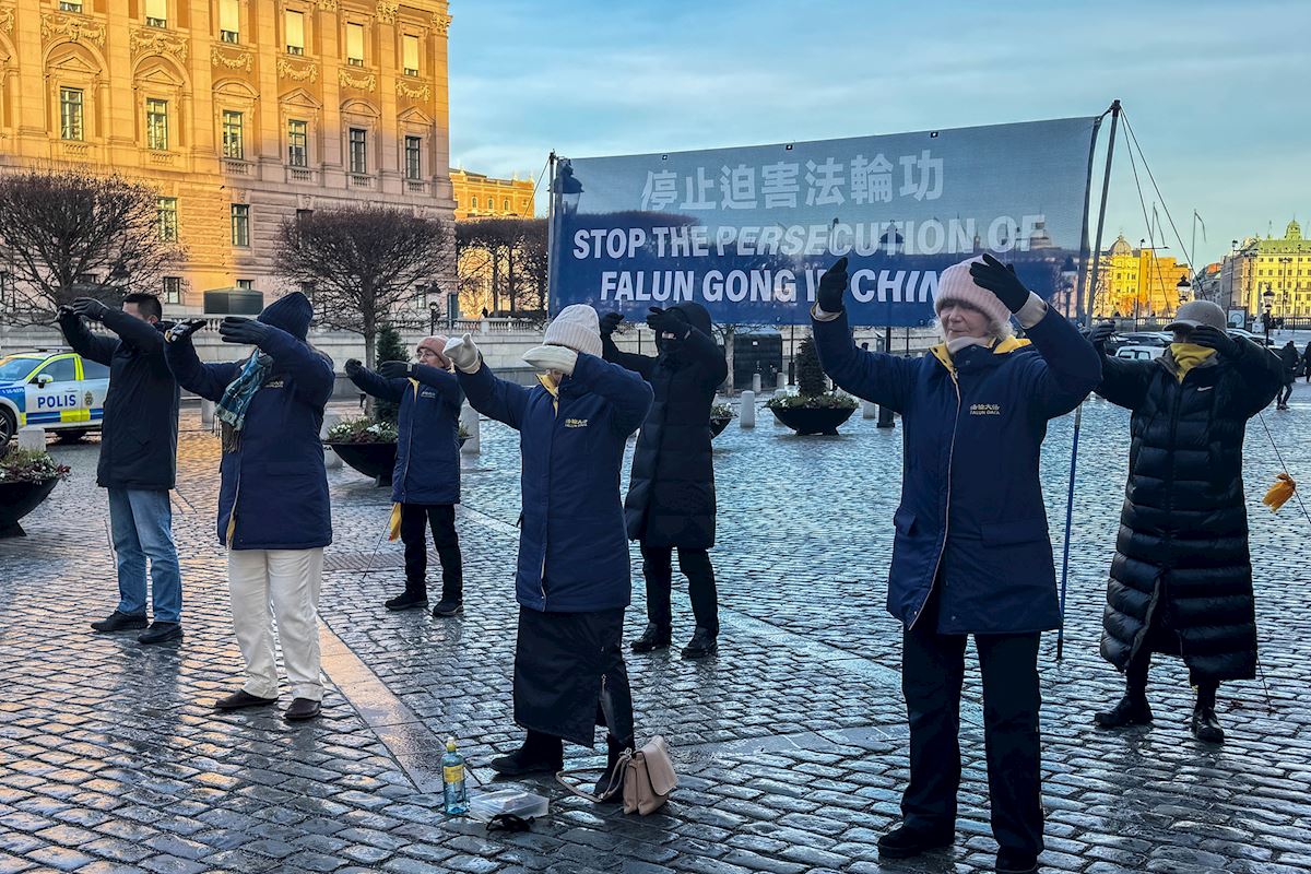 Falun Dafa praktikanti održavali su događaje na Mynttorgetu blizu Kraljevske palate (Kungliga Slottet) i pored poznate koncertne dvorane u Stokholmu svakog petka i subote popodne tokom decembra 2025. Demonstrirali su Falun Dafa vežbe i prikupljali potpise na peticiji kojom se poziva na okončanje progona praktikanata u Kini.