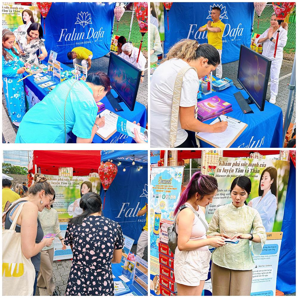 Mnogi ljudi su se zaustavili kod Falun Dafa štanda kako bi gledali demonstracije vježbi i čitali postere. Nakon što su slušali o principima Istinitosti-Dobrodušnosti-Toleranciji i dobrobitima od prakticiranja Falun Dafa, neki su bili zainteresirani i pitali su kako naučiti praksu.