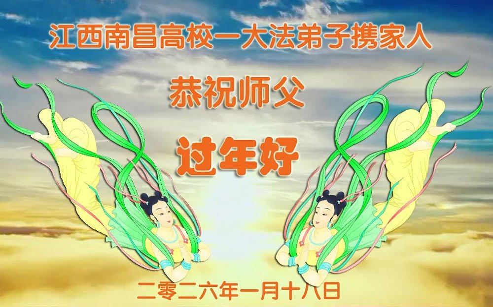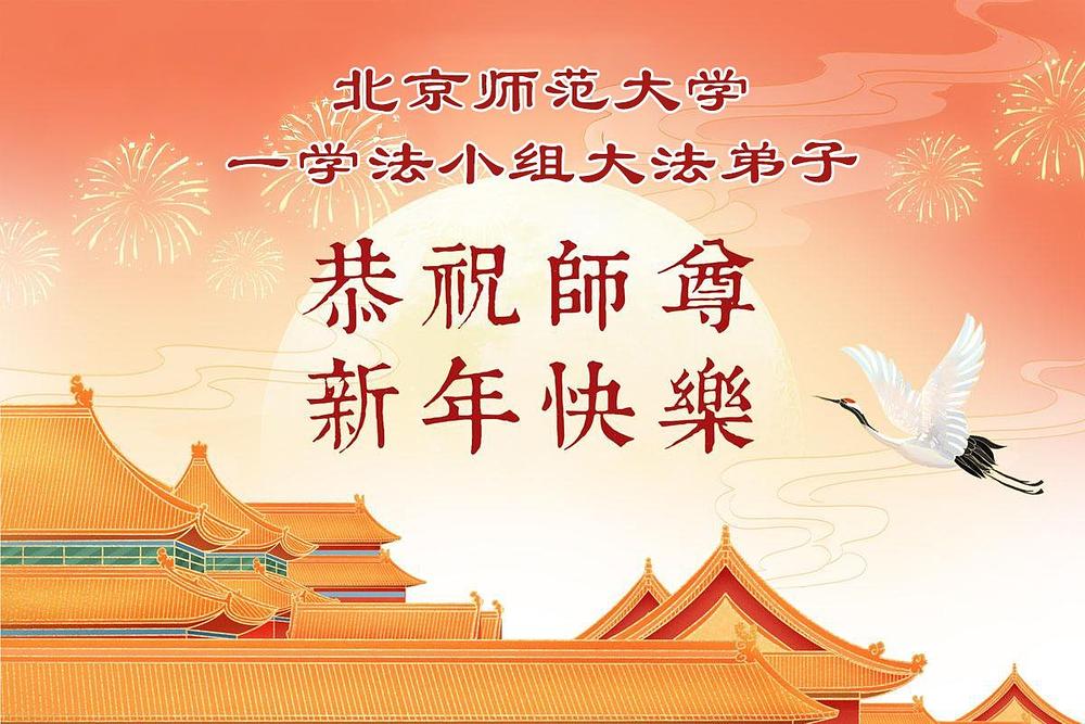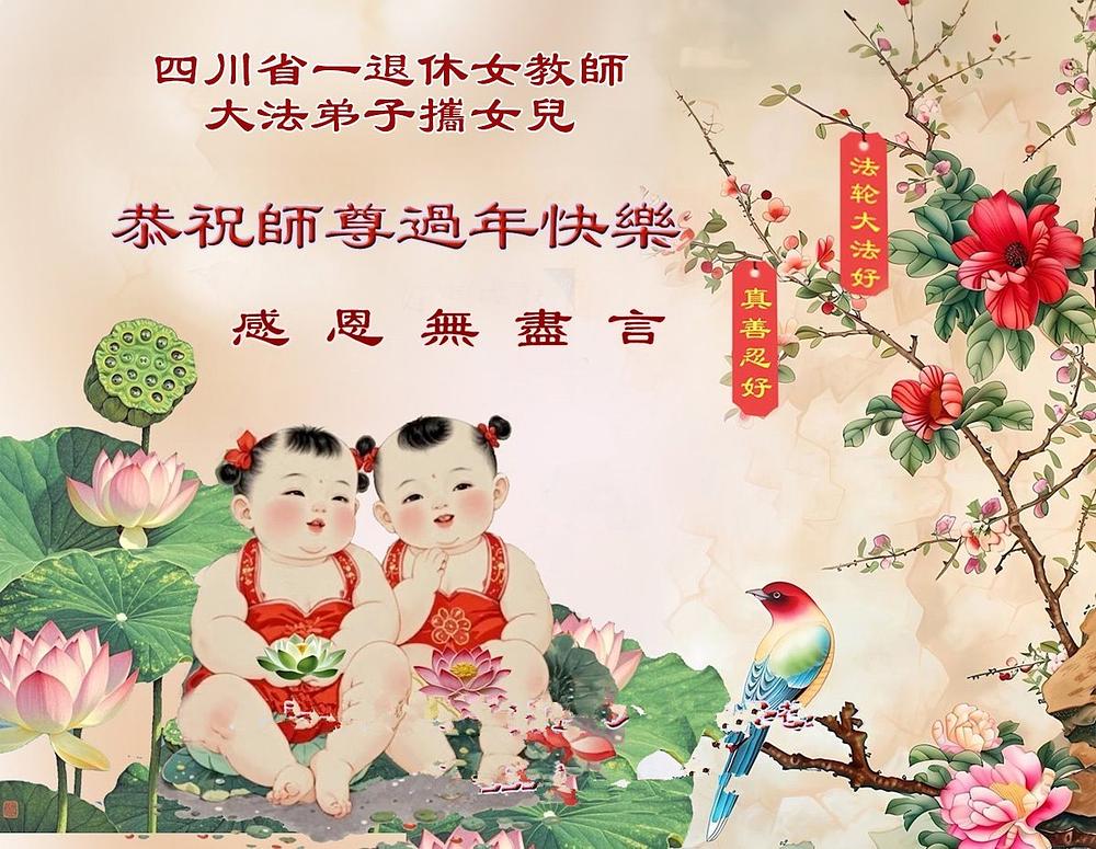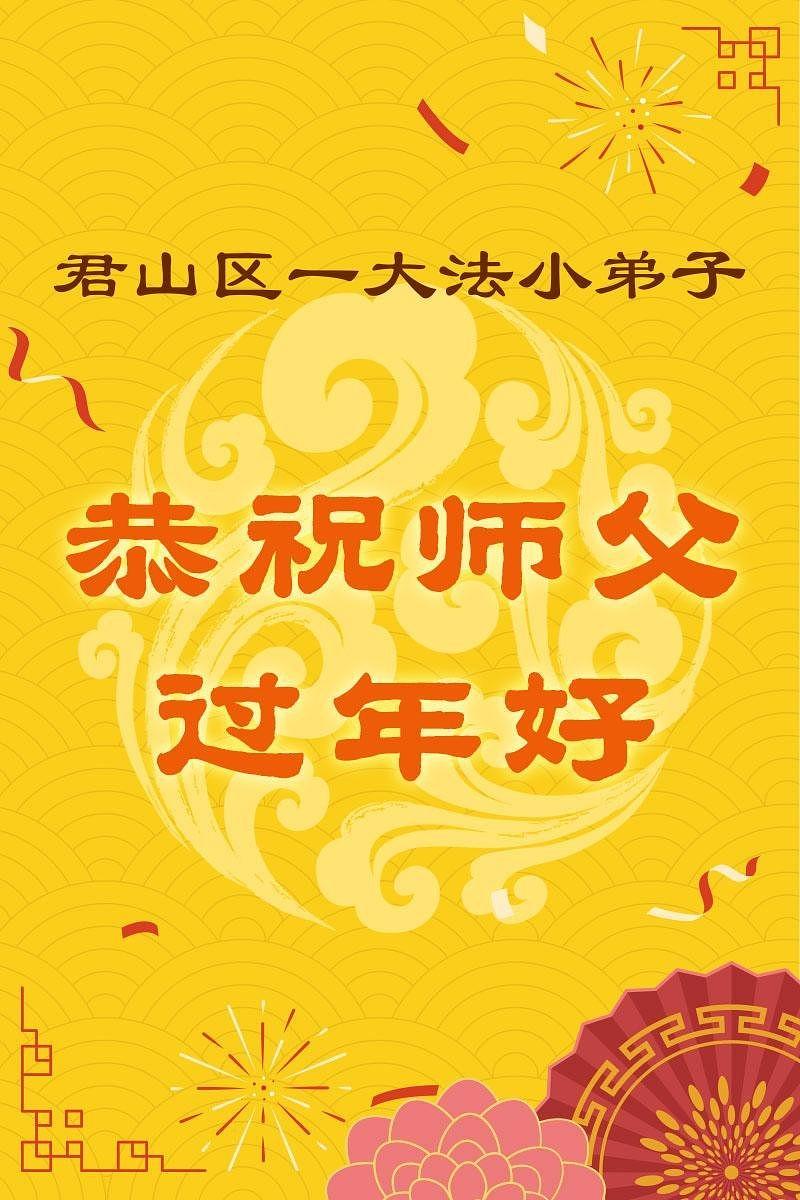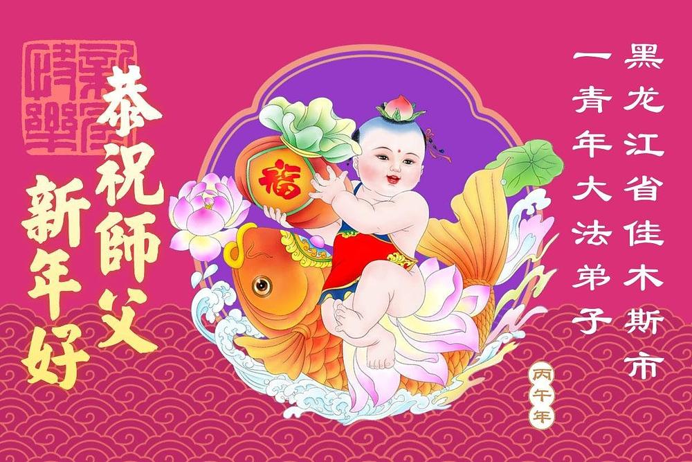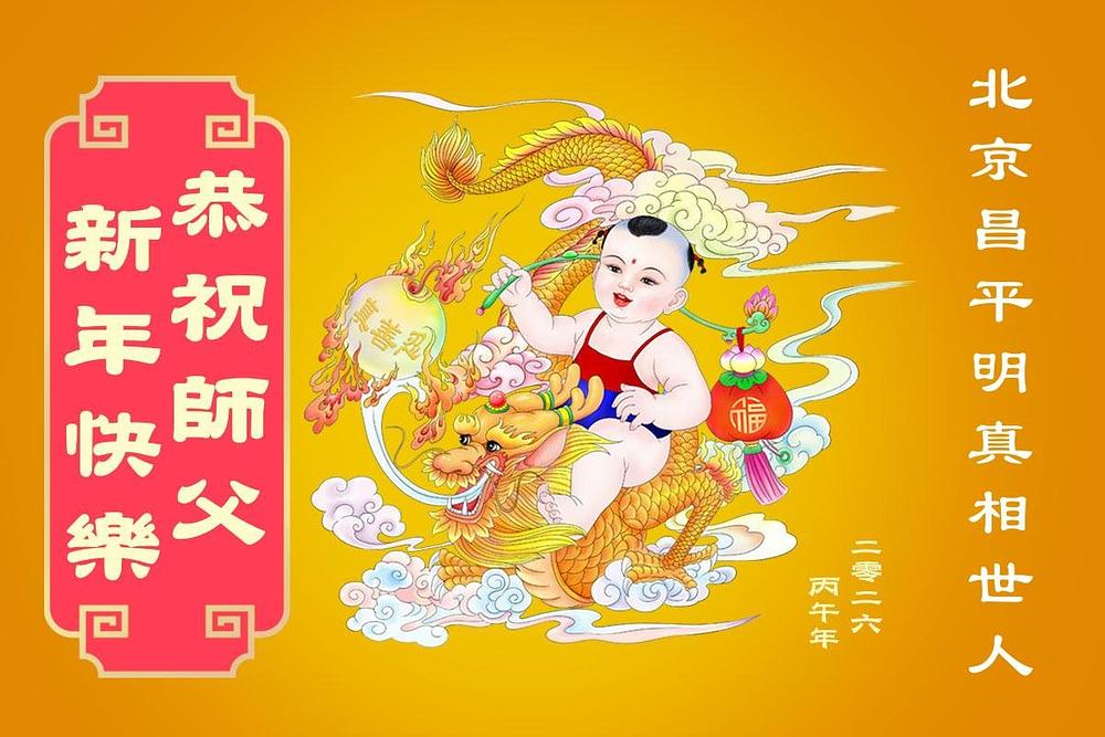 „Želimo Učitelju srećnu Novu godinu! Svi Dafa učenici razumeju svoju odgovornost. Iako su teškoće velike, mi racionalno i mudro koristimo različite načine da pomognemo u spasavanju više ljudi, ispunimo svoje zavete, završimo svoju misiju i dovedemo mnoga živa bića do ispunjenja dok se vraćamo kući sa Učiteljem.“