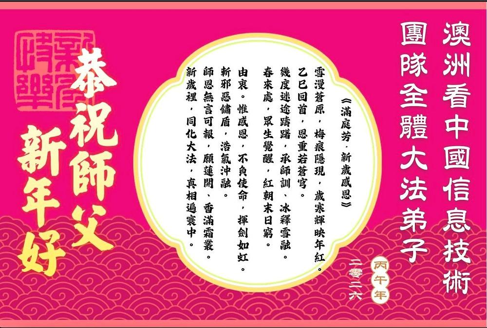 Kako bi proslavili Kinesku novu 2026. godinu, Falun Dafa praktikanti iz Australije, uključujući Canberru, Melbourne, Sydney, Queanbeyan, Brisbane, Adelaide i Queensland, te Auckland, Christchurch i Hamilton s Novog Zelanda, su poslali svoje čestitke za Kinesku novu godinu Učitelju Liju: