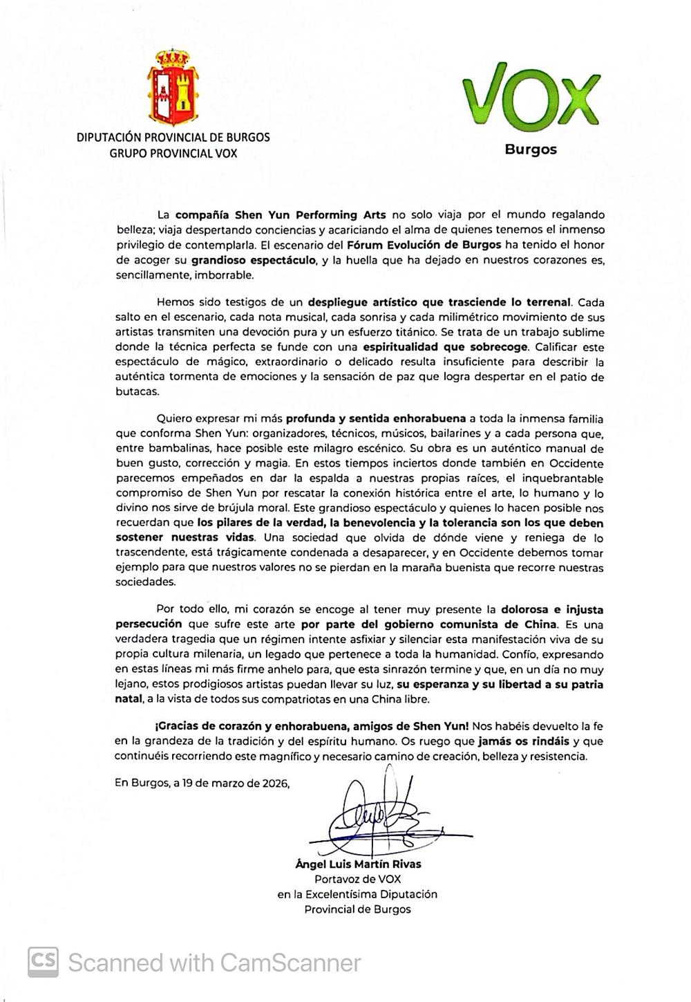 Članovi Pokrajinskog vijeća Burgosa su uručili proklamaciju Shen Yun Performing Arts 19. marta 2026. Proklamacija glasi: