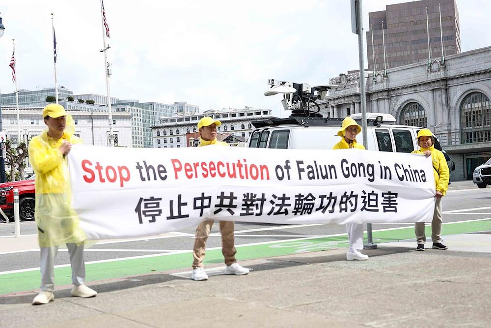 Falun Gong praktikanti su 21. aprila 2026. godine, ispred Gradske vijećnice San Francisca, održali izložbu fotografija kako bi obilježili svoj mirni apel u Pekingu održan 25. aprila 1999. godine.
