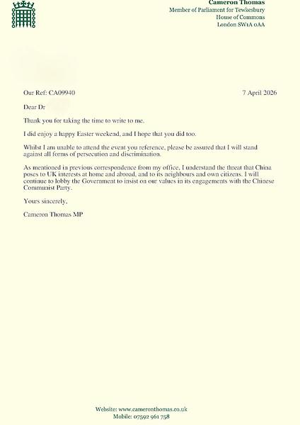 „Budite uvereni da ću se suprotstaviti svim oblicima progona i diskriminacije", napisao je poslanik Kameron Tomas. „Kao što je pomenuto u prethodnoj prepisci iz moje kancelarije, razumem pretnju koju Kina predstavlja interesima Velike Britanije u zemlji i inostranstvu, kao i njenim susedima i sopstvenim građanima. Nastaviću da lobiram kod Vlade da insistira na našim vrednostima u svojim angažmanima sa Komunističkom partijom Kine."