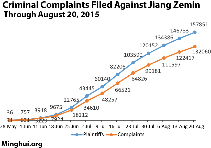 Od kraja maja do 20. avgusta 2015. godine, 157.851 Falun Gong praktikanata i članova njihovih porodica na Minghui je dostavilo ukupno 132.060 tužbi . Od ukupnog broja tužbi 156.080 je iz Kine, a 1.771 je iz 27 drugih zemalja.