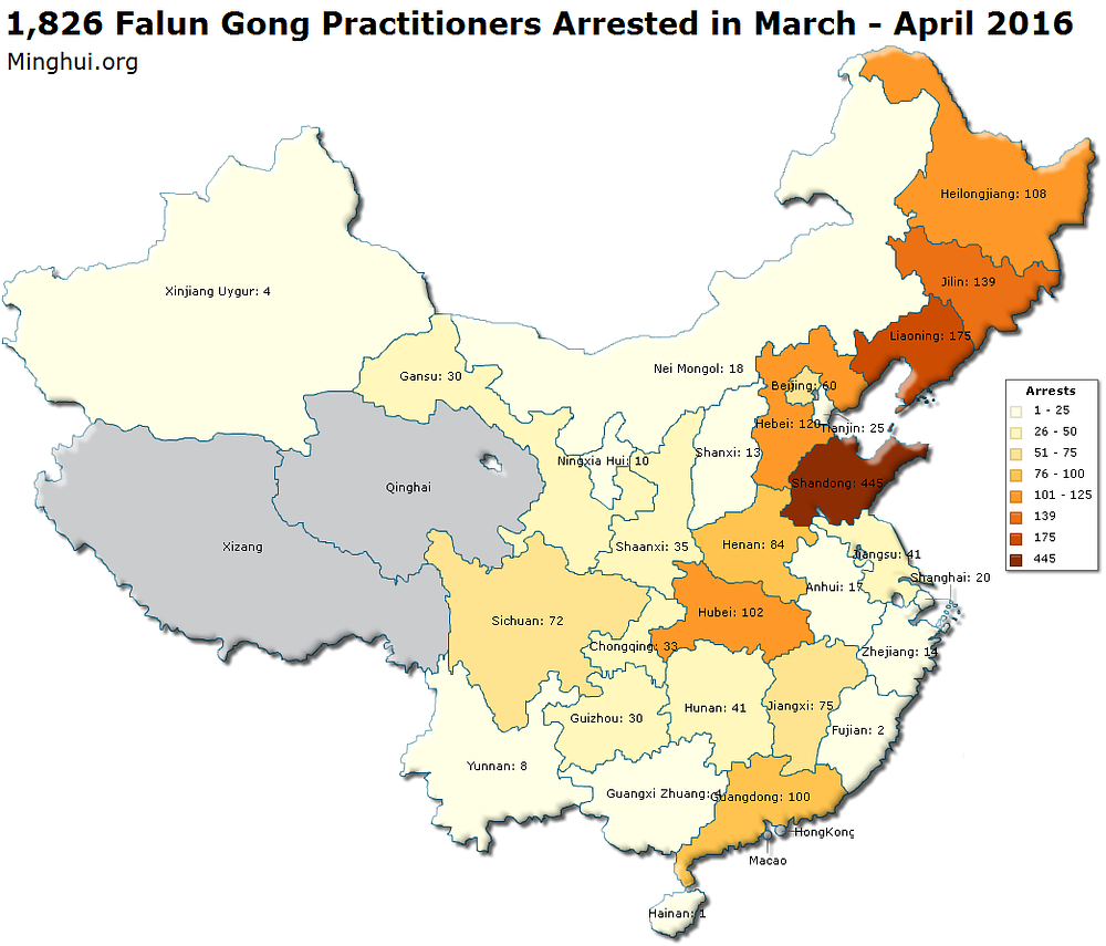 Prema informacijama prikupljenim od web stranice Minghui.org, 1.826 građana je uhapšeno u Kini u martu i aprilu 2016. godine zbog odbijanja da se odreknu Falun Gonga, duhovne discipline koja je progonjena u Kini od strane komunističkog režima.