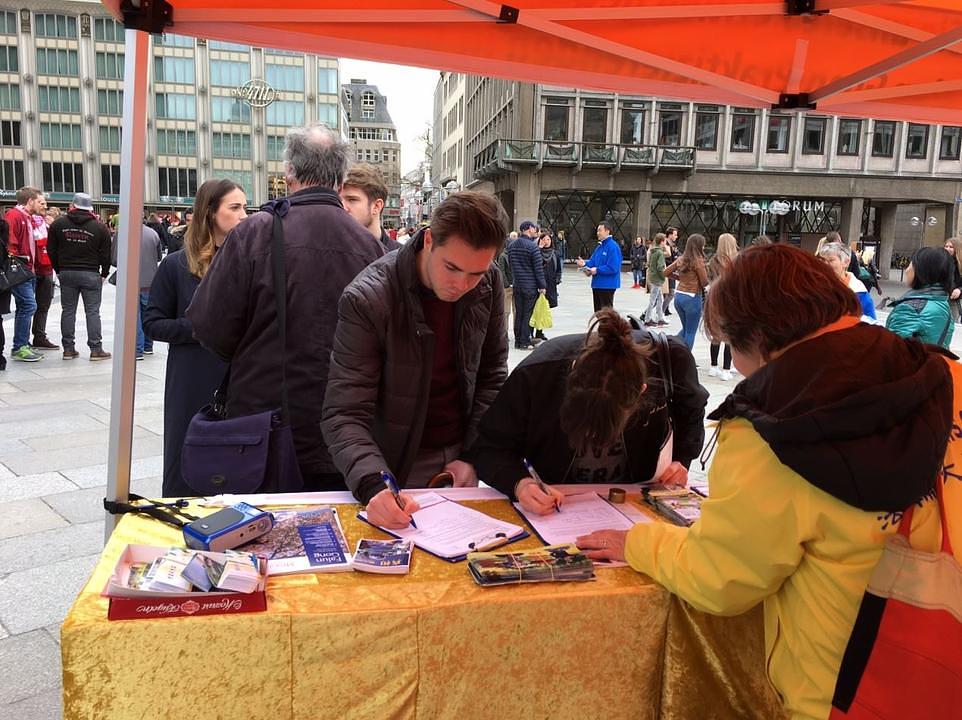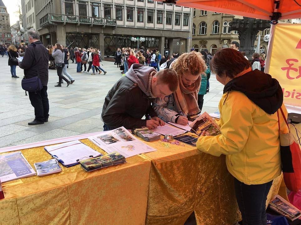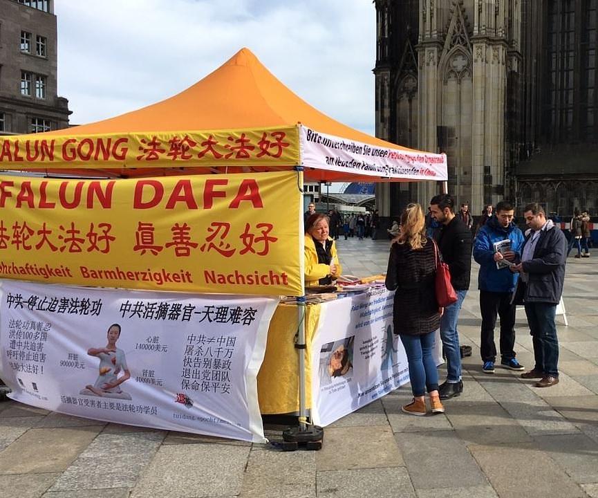 Praktikanti iz Kelna u Njemačkoj često postavljaju svoj štand ispred katedrale u Kelnu i tu razgovaraju sa turistima o progonu, a također prikupljaju potpise na peticiju kojom zahtijevaju kraj zločinima. Fotografije u prilogu su napravljene za vrijeme takvog događaja 4. marta.
