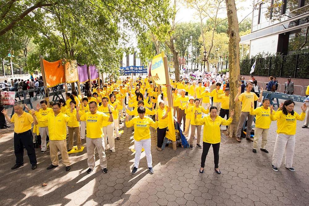 Praktikanti Falun Gonga su, od popodneva 20. septembra do večeri 22. septembra 2017. godine, odlazili pred stalnu misiju Narodne Republike Kine pri UN na 1. Aveniji između 34. i 35. ulice na Manhattanu. Nosili su transparente na kojim je pisalo: "Falun Dafa je divan", "Prekinite progon Falun Gonga", "Dovedite Jiang Zemina pred lice pravde", i tako dalje.